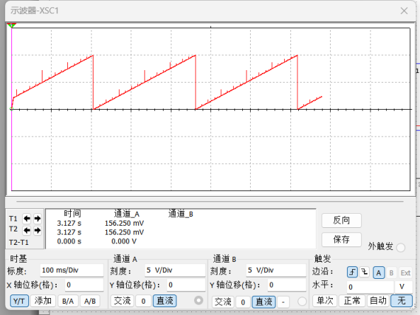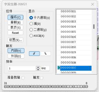 设置字信号发生器为加计数器,能够连续地输出0~255的数字,如图8.13所示。这种连接方式使8位 DAC 能够覆盖0~5整个输出范围,并完成255级8位计数。字信号发生器的编码通过 DAC 在输出端得到模拟电压,可以用示波器观察其波形。