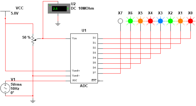 测试过程:打开仿真开关,调整R1电位器阻值,改变模拟电压输入值,用电压表显示电压值,输出指示灯的亮灭表示转换出的数码,灯亮为1,灯不亮为0。转换结束后,当开关J1由低电平变为高电平时允许输出。