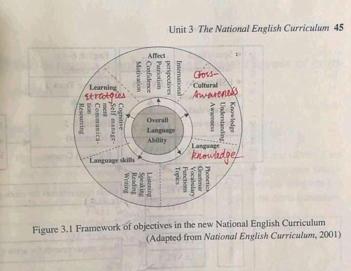 3. The design of new national EnglishCurriculum unifies both primary and secondary school English into one continuumof development and divides English language teaching and learning into ninecompetence-based levels. The new curriculum is designed to promote the studentsoverall language ability which is composed of five interrelated componentsnamely Language skills,language knowledge,affects, learning strategies and cultural understanding. Eachcomponent is further divided to a few subcategories as shown in the diagram,language teaching is no longer aimed only for developing language skills andknowledge but expanded to developing learners’ positive attitude, motivation,confidence as well as strategies for life-long learning along withcross-cultural knowledge, awareness and capabilities.
