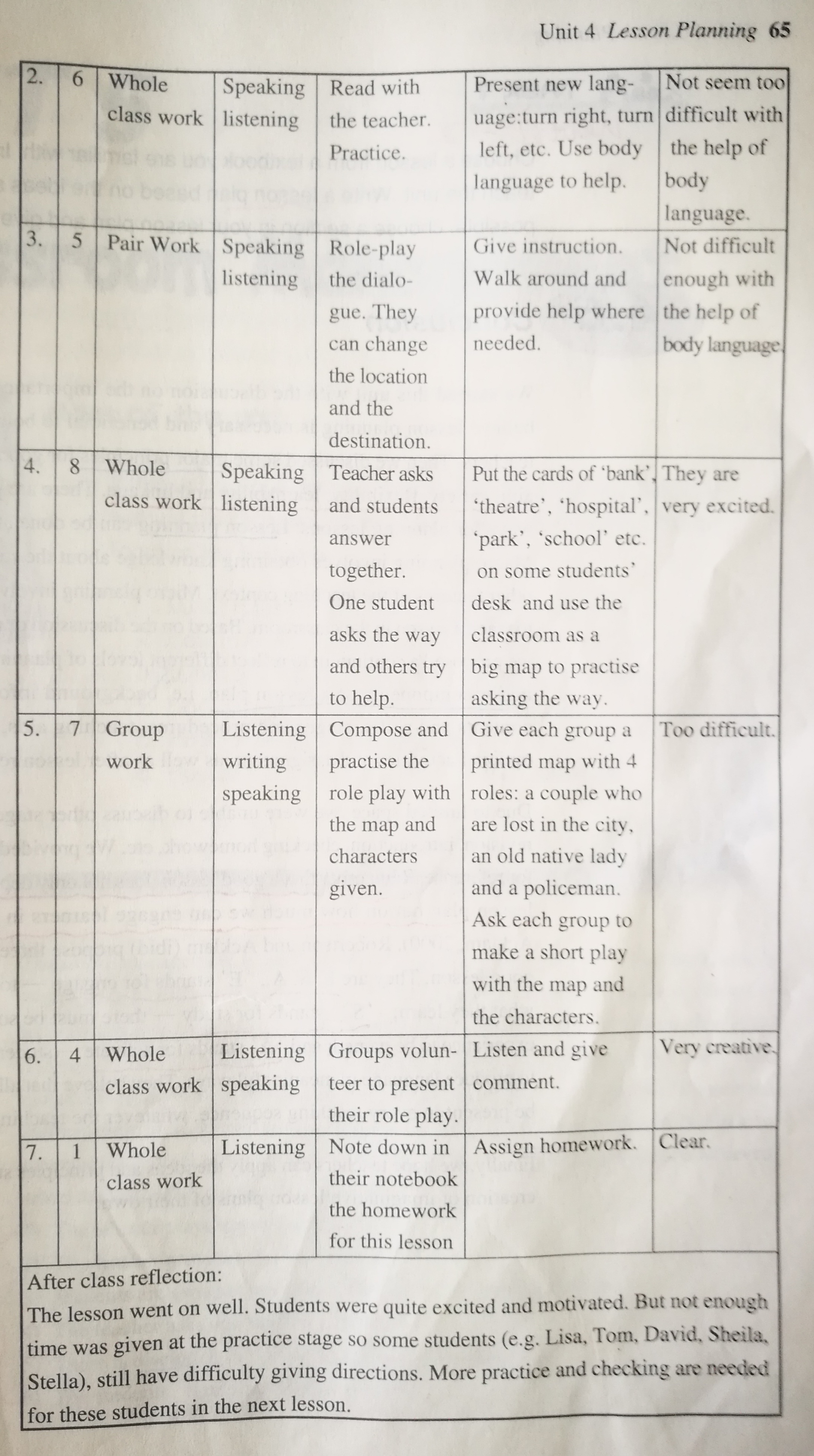 4. We discussed the major components of a lesson plan ( aims,language contents and skills, and stages and procedures.