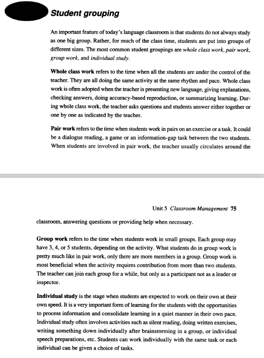 An important feature of today's language classroom is that students do not always as one biggroup. Rather for much of the class time students are put into groups of different sizes. The most common student groupings are whole class work, pairwork, group work and individual study