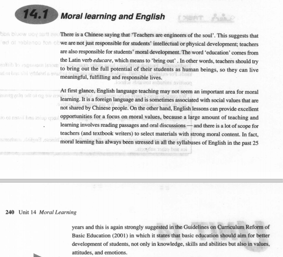 There is a Chinese saying that “Teachers are engineers of the soul”. This suggests that we are not just responsible for students' intellectual or physical development; teachers are also responsible for students' moral development. The word “education” comes from the Latin verb educare, which means to “bring out”. In other words, teachers should try to bring out the full potential of their students as human beings, so they can live meaningful, fulfilling and responsible lives.