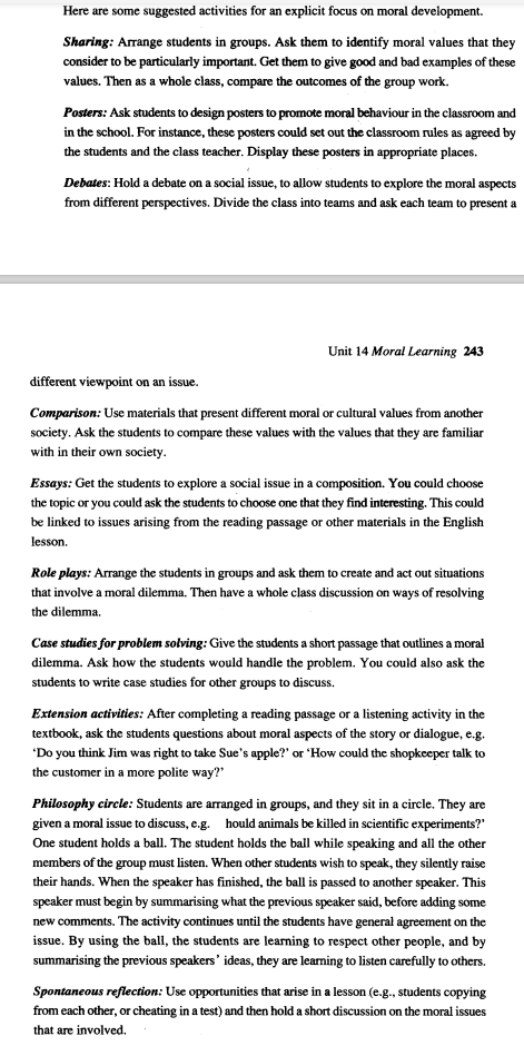 II. Activities for moral learning