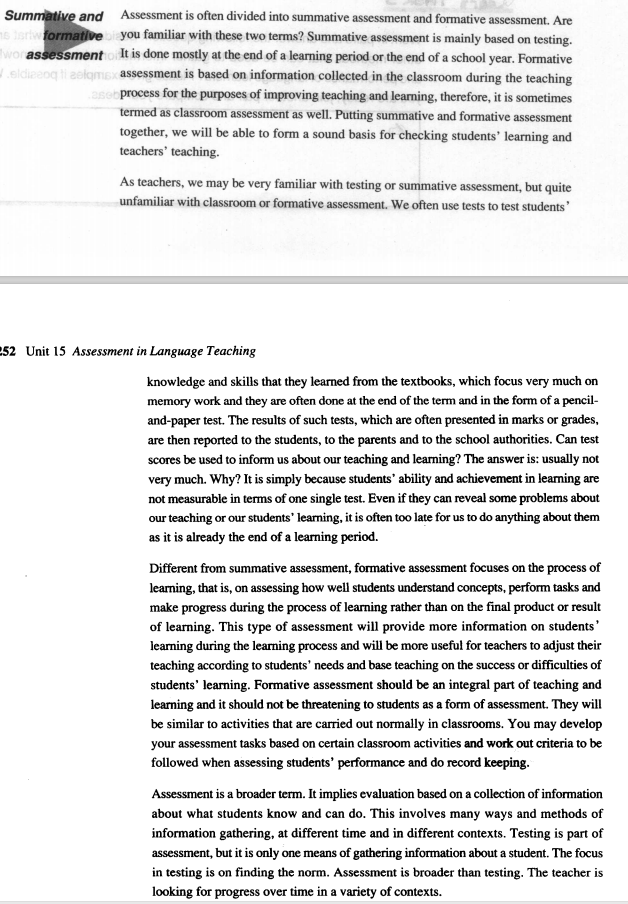 1. Summative and formative assessment: testing, formal, standardised/ information, to improve teaching and learning, in classroom.