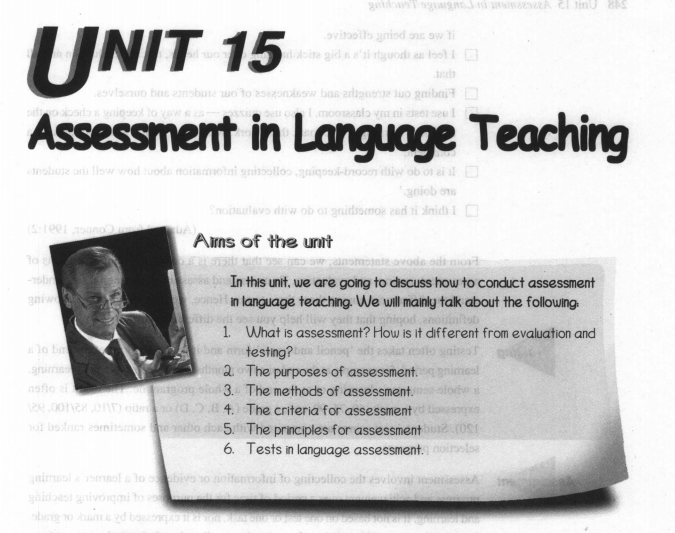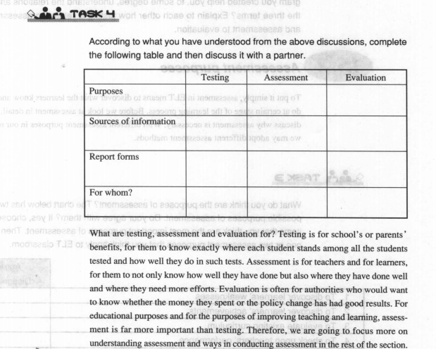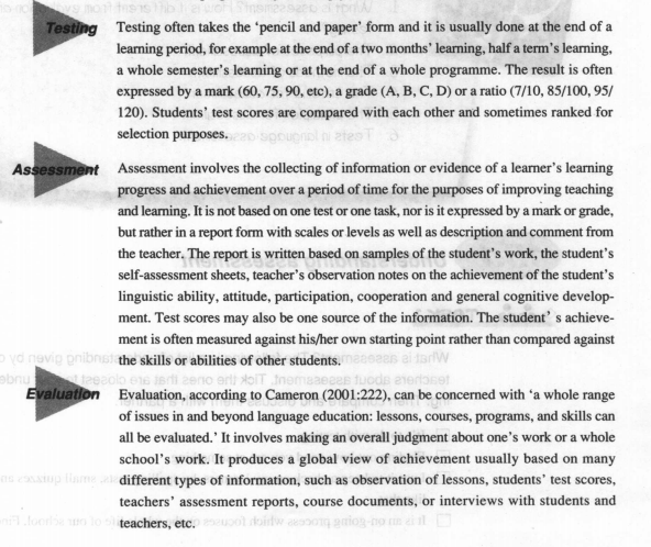 Evaluation: a whole range of issues in and beyond language education: lessons, courses, programs, and skills. It involves making an overall judgment about one's work or a whole school's work.