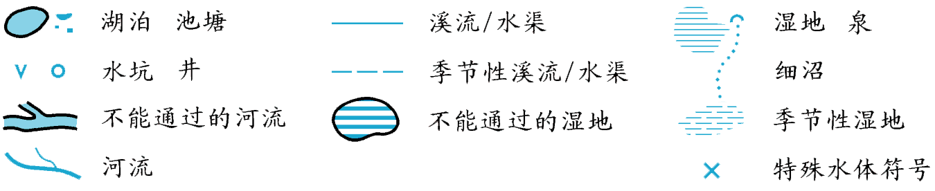 ③水系与湿地(淤泥地、沼泽地),用蓝色表示。