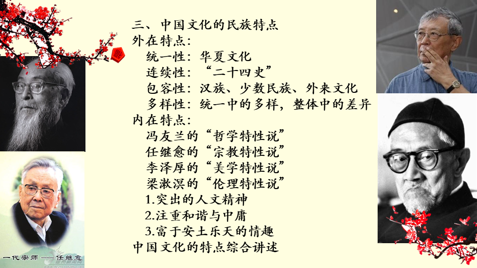 中国文化的内在特点说法很多,概括起来也很难。大体说来,有冯友兰先生的“哲学特性说”。他认为,中国文化具有以儒学为主导因素的哲学特性,儒学提供了丰富的人生智慧,凝结成中华民族特有的心理素质,塑造了中国传统农民和知识分子的特殊性格。还有任继愈先生的“宗教特性说”。他认为,中国文化是儒、道、释三教合一,儒学以及后来的宋明理学在实质上都是宗教。儒、道、释三教合一的思潮构成了唐宋以后直到鸦片战争前后近千年的宗教史和思想史。也有李泽厚先生的“美学特性说”。他认为,中国文化的传统是社会政治哲学始终占主导地位,并且同兵、农、医、艺四大实用文化联系密切,它的哲学追求是美感和乐感,而不是苦感和罪感。还有梁漱溟先生的“伦理特性说”。他认为,中国文化以人伦关系为基本,讲究父慈子孝、兄友弟恭、君贤臣忠等,追求群体互助,同西方世界的“个人本位”和“自我中心”很不相同。这四种观点具有代表性,跟个人所研究的侧重面有很大关系。我们也不妨这样理解中国文化的内在特点:一是中国文化突出人文主义精神,它不像西方文化那样依附于神学独断。中国虽然也有宗教,但它并没有渗透到日常生活的各个方面。相反,在中国人的生活里,宗法道德观念才是维系整个社会的根本纽带。长期以来,中国人的行为准则并不是遵循某个神的意志,而是要合乎儒家所提倡的道德规范。在中国人的观念里有所谓“天”的概念,历代帝王也有祭天的仪式,但就其实质来看,这里“天”不过是自然而已。人们通常所说的“天道”,实际上也指的是人类社会的道德秩序。二是中国文化注重和谐与中庸。它不像西方文化那样讲求分别与对抗,而是主张“天下同归而殊途,一致而百虑”(《周易·系辞下》),“提倡在主导思想的规范下,不同派别、不同类型、不同民族之间思想文化的交互渗透,兼容并包,多样统一”(张岱年、方克立:《中国文化概论》)。中国传统哲学所讲的“和而不同”,就是讲各种不同质的事物和谐地融合在一起,オ能产生新的事物。中国古代的“中庸之道”,被认为是“天下之大本”“天下之达道”,如果宇宙万物和人类社会不偏不倚,各安其位,就能够达到“和”的最佳状态,也就是人生和社会的最佳境界。三是中国文化富于安土乐天的情趣。它不像西方文化那样追求冒险与刺激。中国古代一直是一个以农业为主的自然经济社会,人们爱土、敬土、安土,把土地当作自己的生命与依靠,因此,人们“日出而作,日入而息,凿井而饮,耕田而食”(先秦《击壤歌》),唯一祈求的就是天下太平,丰衣足食,一旦遇到战乱便梦想有一个“世外桃源”。由安土乐天的心理而产生了一种浓厚的乡土情谊,凡是那些离乡背井的人,一个个都要思乡、怀旧、寻根、问祖,这同西方文化确实大不相同。