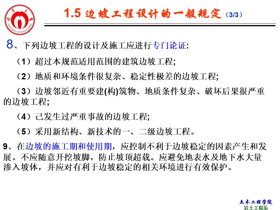 9、在边坡的施工期和使用期,应控制不利于边坡稳定的因素产生和发展。不应随意开挖坡脚,防止坡顶超载。应避免地表水及地下水大量渗入坡体,并应对有利于边坡稳定的相关环境进行有效保护。