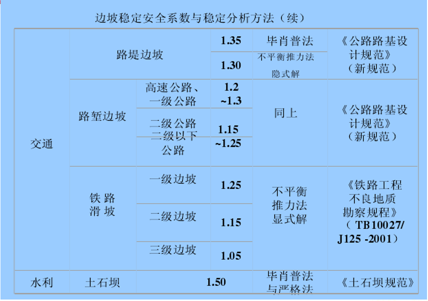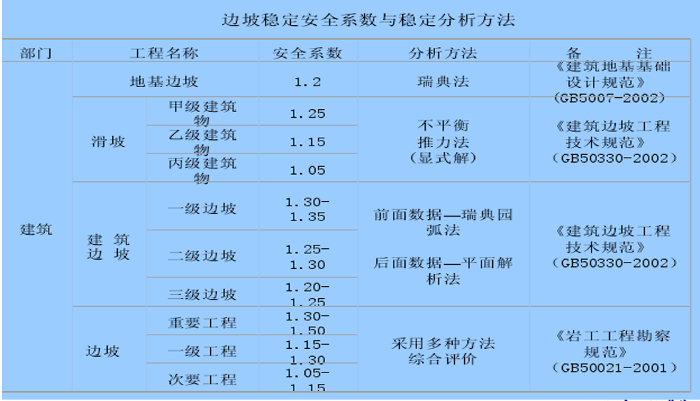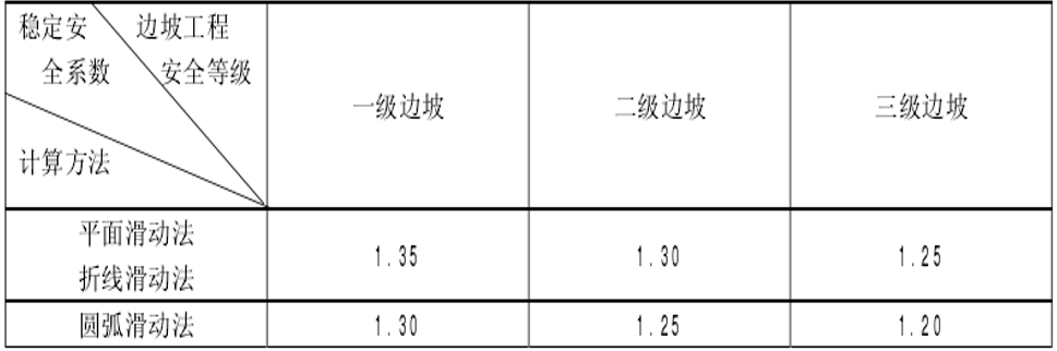 注:1 、表中地震工况的安全系数仅适用于塌滑区内无重要建构筑物的边坡;