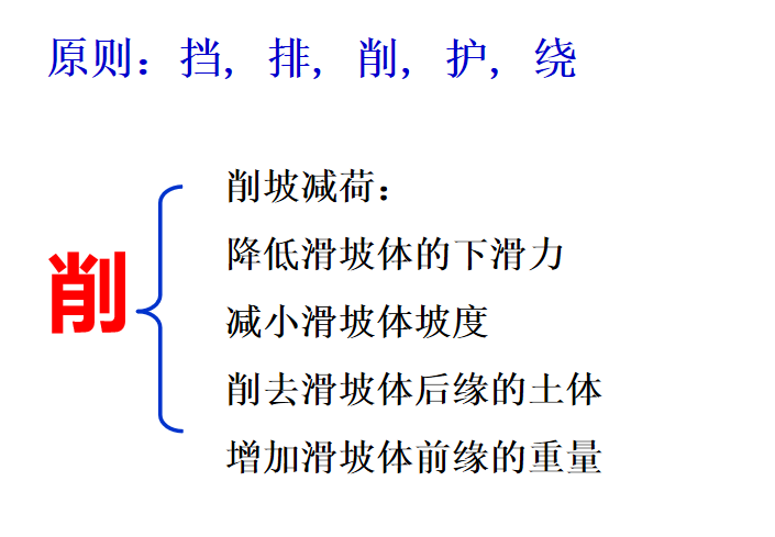 削坡减载法:由于减重是在滑坡后缘挖除一定数量的滑体而使滑坡稳定下来,因而它适用于推动式滑坡或由塌落形成的滑坡,并且滑床上陡下缓,滑坡后缘及两侧的地层稳定,不致因刷方而引起滑坡向后或向两侧发展。