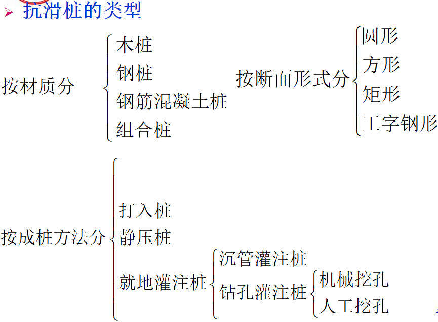 木桩:最早采用的桩,其特点是就地取材、方便、易于施工,但桩长有限,桩身强度不高,一般用于浅层滑坡的治理、临时工程或抢险工程。