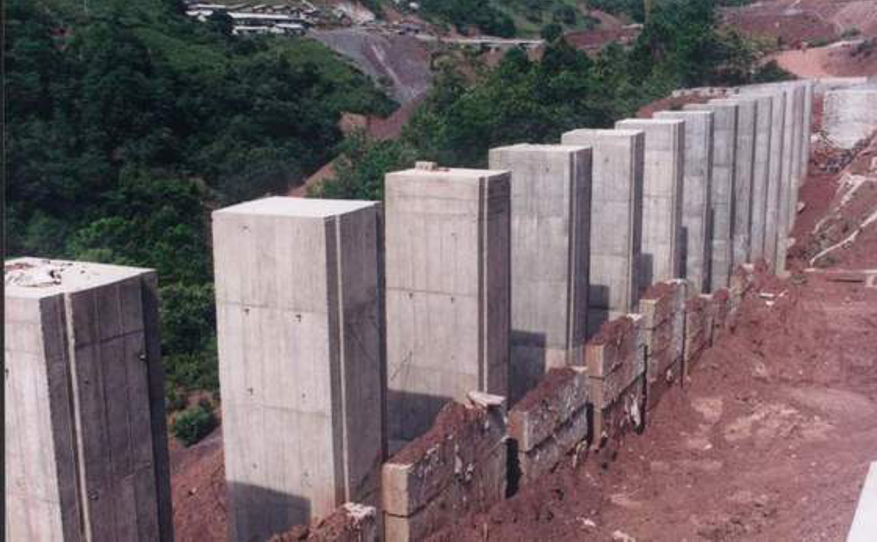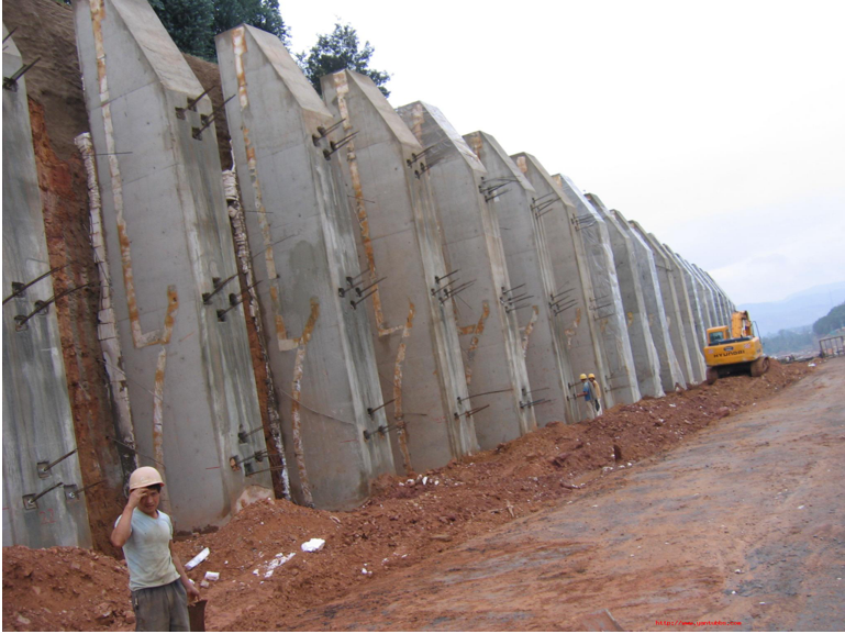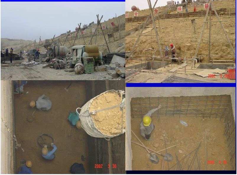 就地灌注抗滑桩:施工常用,机械钻孔速度快,桩径可大可小,适用于各种地质条件,但对地形较陡的边坡工程,机械进入和架设困难较大,另外,钻孔时的水对边坡的稳定也有影响。人工成孔的特点是方便、简单、经济,但速度较慢,劳动强度高,遇不良地层(如流沙)时处理相当困难,另外,桩径较小时人工作业困难,桩径一般应在1000mm以上才适宜人工成孔。
