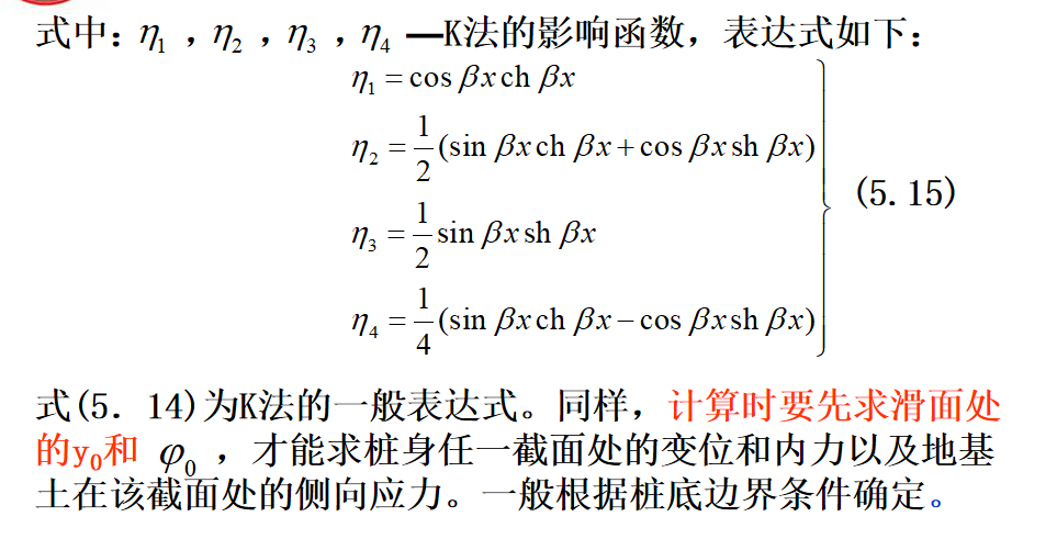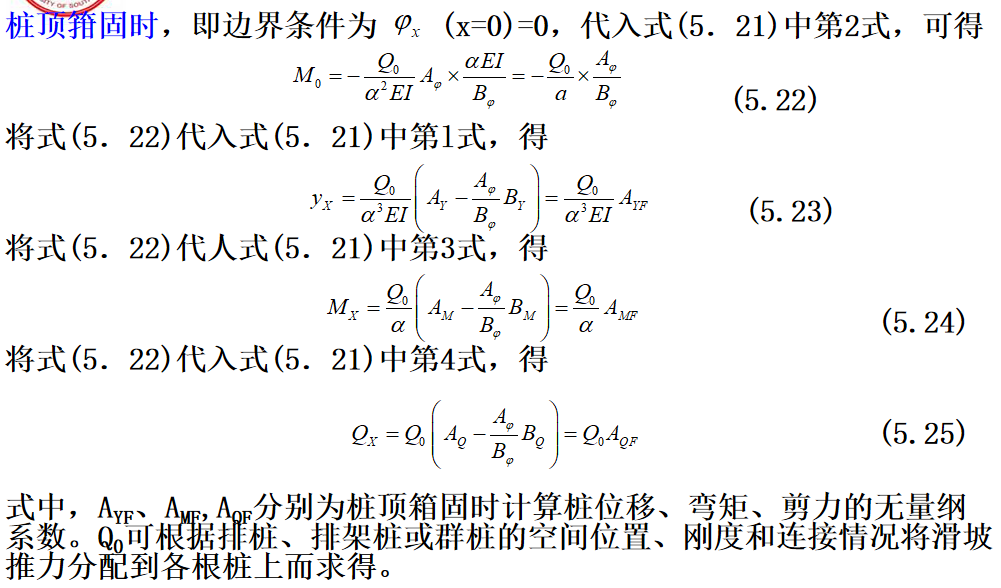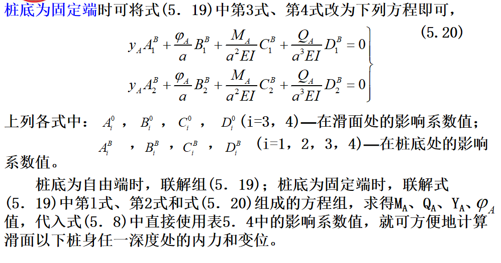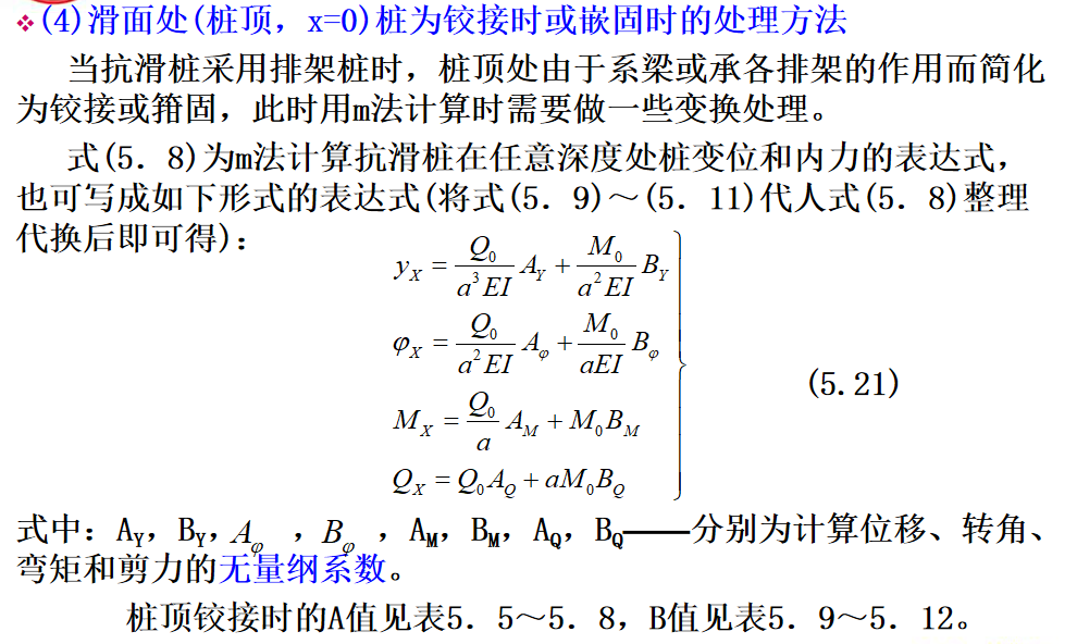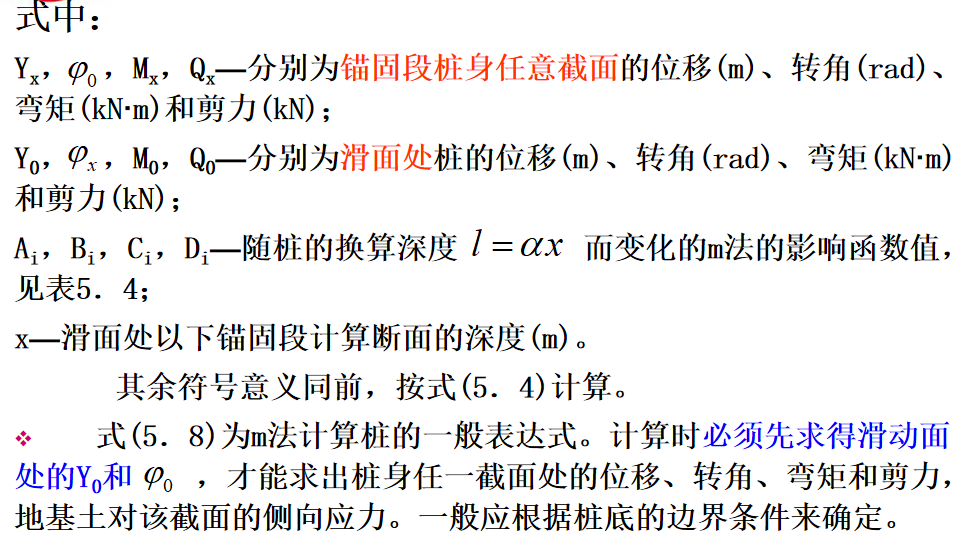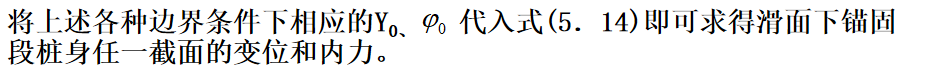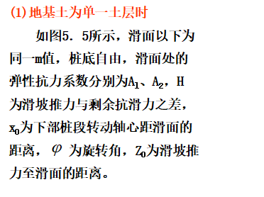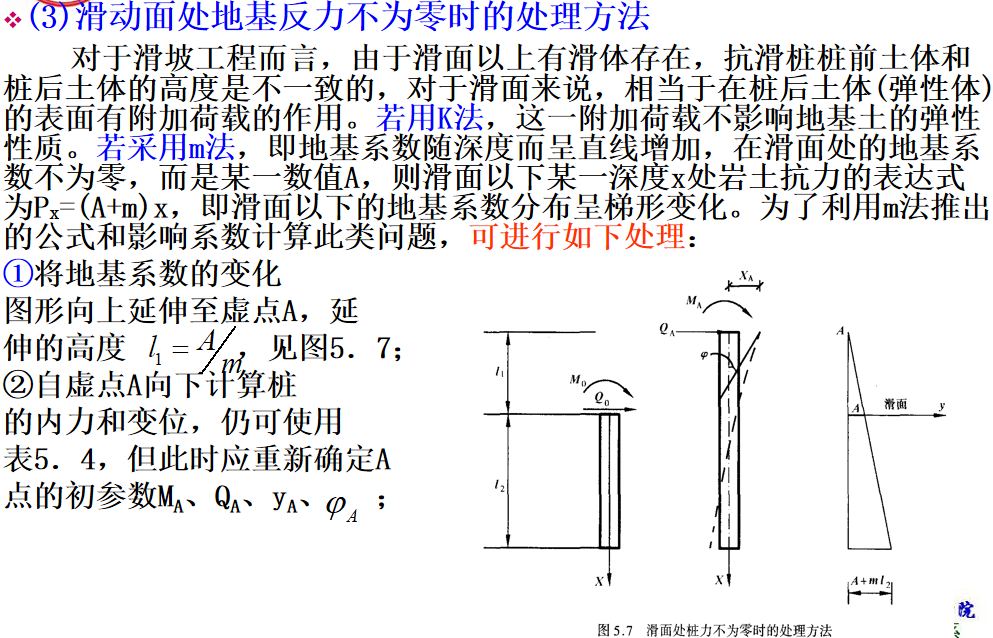 抗滑桩滑面以上部分所受荷载,见下图,可以将其对滑面以下桩段进行简化,简化后桩的计算图式见图(5.6b)。此时,可根据桩周土体的性质确定弹性抗力系数,建立挠曲微分方程式,通过数学求解可得滑面以下桩段任一截面的变位和内力计算的一般表达式。最后根据桩底边界条件计算出滑面处的位移和转角,再计算出桩身任一深度处的变位和内力。