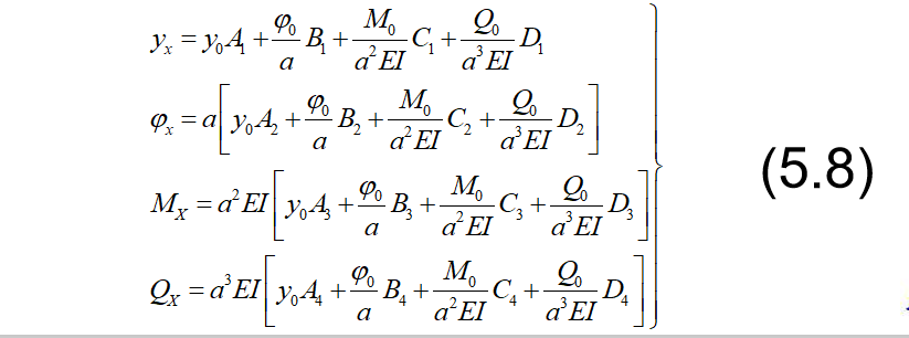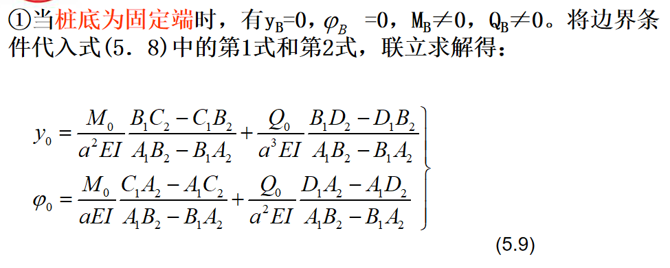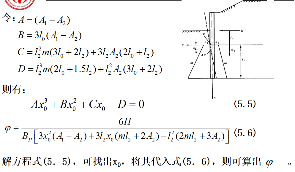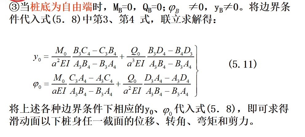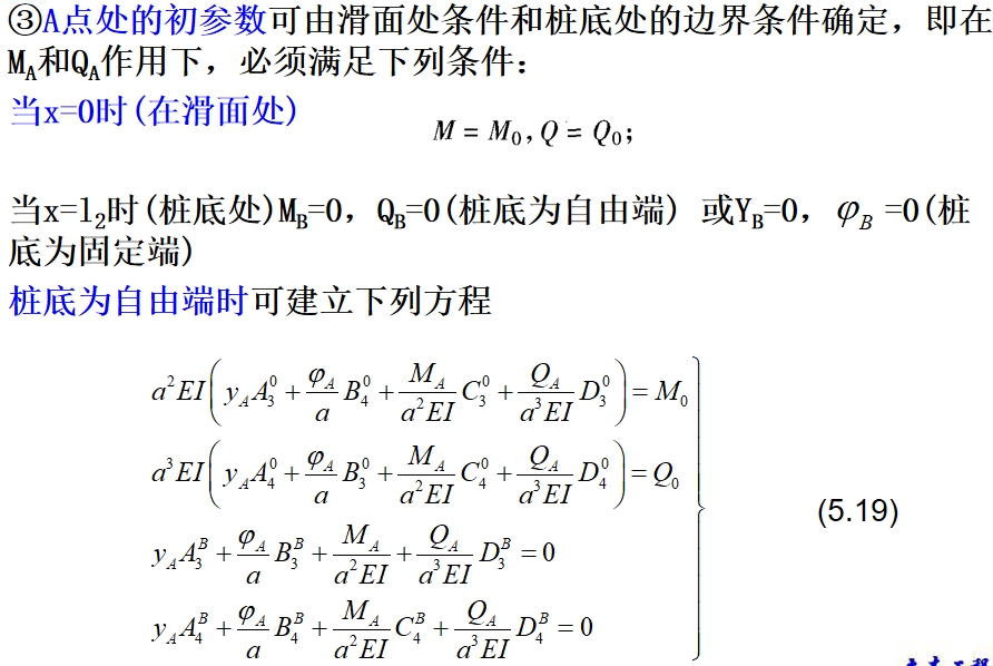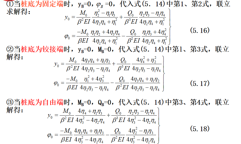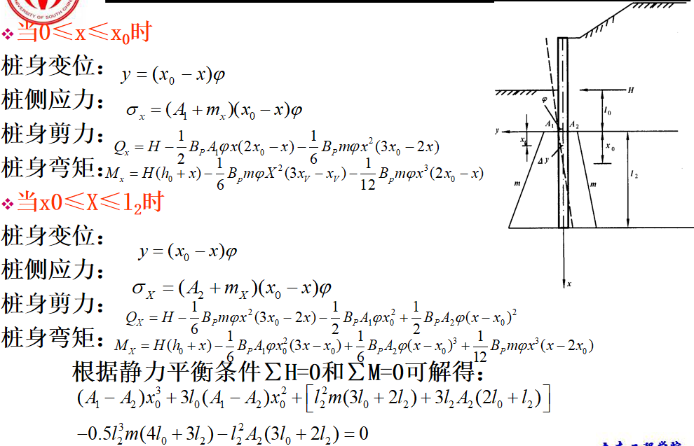 抗滑桩滑面以上部分所受荷载,见下图,可以将其对滑面以下桩段进行简化,简化后桩的计算图式见图(5.6b)。此时,可根据桩周土体的性质确定弹性抗力系数,建立挠曲微分方程式,通过数学求解可得滑面以下桩段任一截面的变位和内力计算的一般表达式。最后根据桩底边界条件计算出滑面处的位移和转角,再计算出桩身任一深度处的变位和内力。
