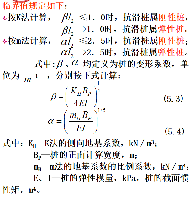 试验研究表明:当抗滑桩埋入稳定地层内的计算深度为某一临界值时,可视桩的刚度为无穷大,桩的侧向极限承载力仅取决于桩周土的弹性抗力大小。这个临界值就是判断刚性桩或弹性桩的标准。