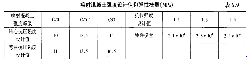 4)喷射混凝土的重度可取22kN/m3,弹性模量按表6.9采用,喷射混凝土与岩面的粘结力:整体状与块体状岩体不应低于0.7MPa,碎裂状岩体不低于0.4MPa。喷射混凝土与岩体的粘结强度试验方法应遵循《锚杆喷射混凝土支护技术规范》的规定。