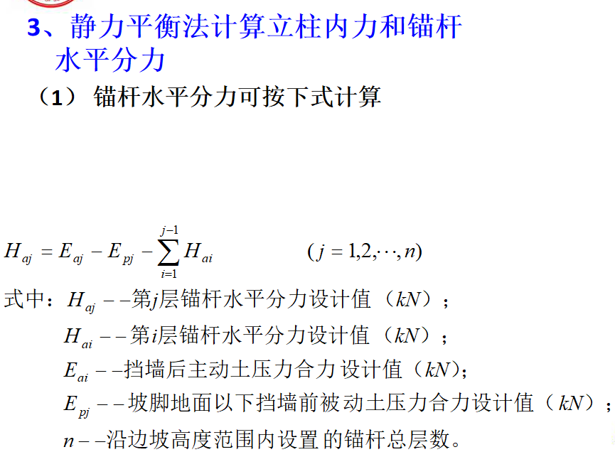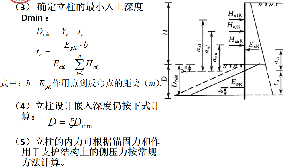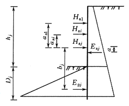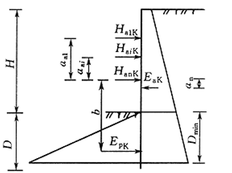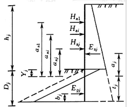 对板肋式和桩锚式挡墙,当立柱(肋柱和桩)入土深度较小或坡脚土体较软弱时,可视立柱下端为自由端,按静力平衡法计算。