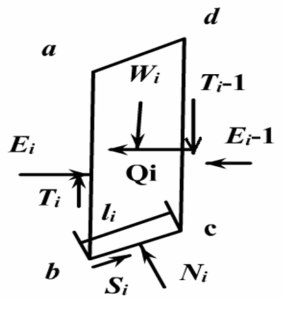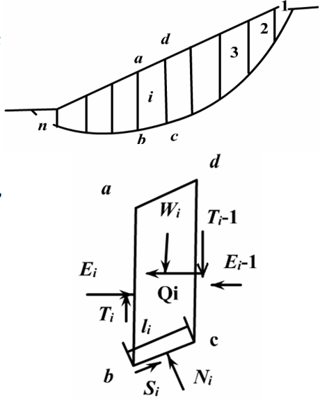 (1)坡体分条:把滑动土体竖向分为n个土条,在其中任取1条记为i,如右上图所示;