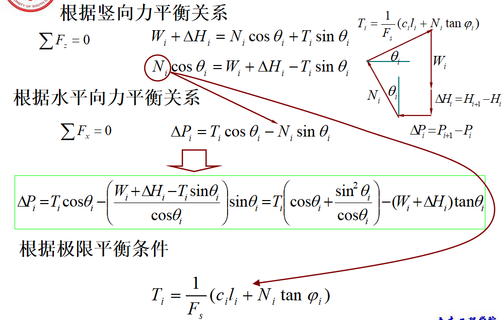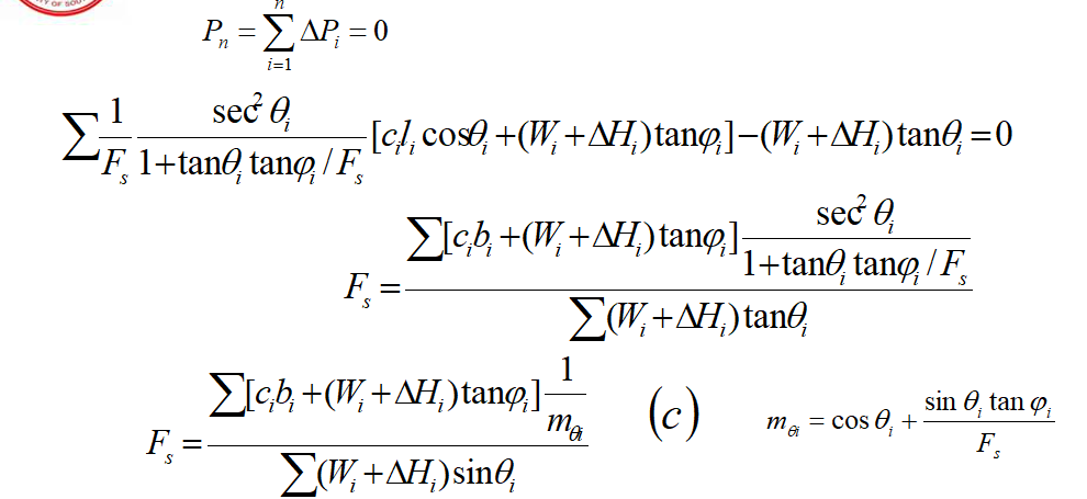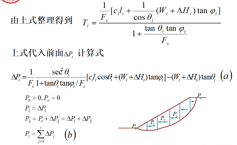 上式与毕肖普计算公式很相似,但分母有差别。毕肖普公式是根据滑动面为圆弧面,滑动土体满足力矩平衡条件推导出的。简布法则是利用力的多边形闭合条件和极限平衡条件,最后由条间水平向推力代数和为零的条件推出的。