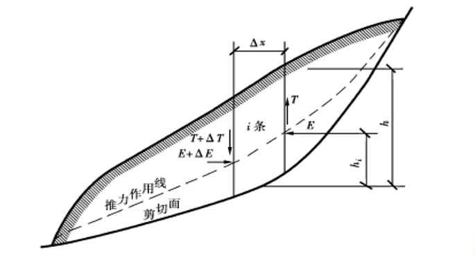 (4)假定已知推力线的位置,即简单地假定土条侧面推力成直线分布,如果坡面有超载,侧面推力成梯形分布,推力线应通过梯形的形心;如果无超载,推力线应选在土条下三分点附近,对非粘性土(c′=0)可在三分点处,对粘性土(c′>0),可选在三分点以上(被动情况)或选在三分点以下(主动情况)。