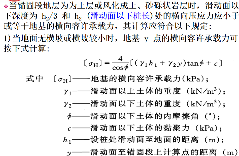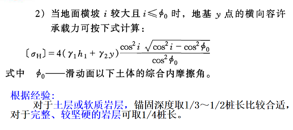 抗滑桩锚固深度的计算,应根据地基的横向容许承载力确定。当桩的位移需要控制时,应考虑最大位移不超过容许值。