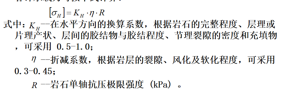 (1)地层为岩层时,桩的最大横向压应力 应小于或等于地基的横向容许承载力[地基的横向容许承载力与岩石单轴抗压极限强度的对应关系可按有关规范采用]。当桩为矩形截面时,地基的横向容许承载力可按下式计算:
