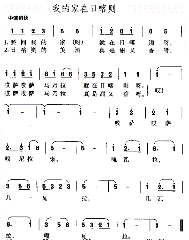 2.过程与方法目标: ①能情绪饱满地、准确地演唱歌曲《我的家在日喀则》,深刻体会歌曲中抒发的藏族人民热爱家乡的喜悦心情。