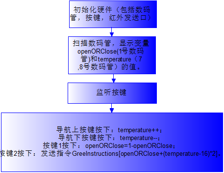 该程序主要分为三个模块,即按键模块,数码管显示模块,红外通信模块。按键模块用定时器0计数,每个1ms对按键状态进行一次扫描,在连续扫描100次的过程中如果有一般的次数某个按键处于按下状态则表示该按键已经按下触发相关功能;数码管显示模块也是每隔1ms扫描一个数码管,将开关状态显示在第一个数码管,将温度值显示在第7,8个数码管上;红外通信模块用定时器1中断函数进行发送并控制其发送时间,根据格力空调遥控编码原理依次发送起始码+35位数据码+连接码+32位数据+停止码,低电平时发送38KHZ红外波,高电平不发送。