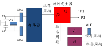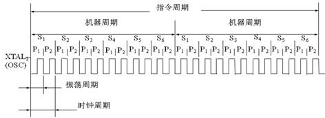 (2)   状态周期: 振荡信号经二分频后形成的时钟脉冲信号,用S表示。一个状态周期的两个振荡周期作为两个节拍分别称为节拍P1和节拍P2。P1有效时,通常完成算术逻辑操作;P2有效时,一般进行内部寄存器之间的传输。