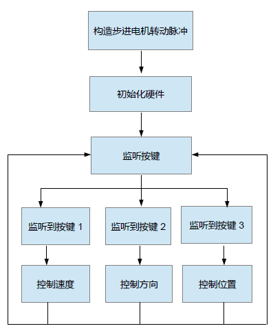 实现解释:通过在P4.1、P4.2、P4.3、P4.4口每隔5ms*sudu的时间输入高电平(sudu值由Key1键进行确定,并在数码管最右端显示,分别为1-12这12个档位,数值越大,转速越慢),并结合Key2键确认旋转方向(按下按键则按相反方向进行旋转),再结合Key3键控制步进电机旋转还是停止