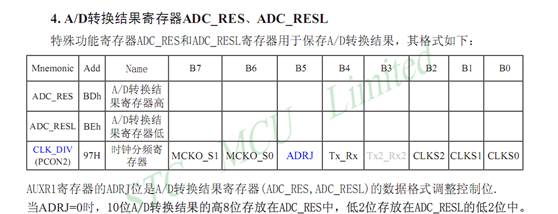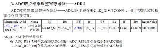 初始化设计CLK_DIV=#00H,ADC_RES[7:0]存放高8为ADC结果,ADC_RESL[1:0]存放低2位ADC结果。