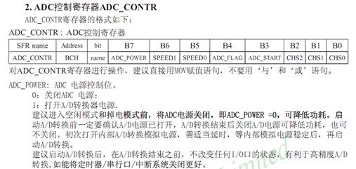 ADC_CONTR=0X8C; //10001100,打开AD转换电源,启动AD转换,后三位决定P1^4作为A/D输入