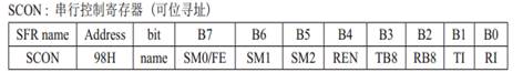 RI:接收中断标志位,在方式0中,接受完8位数据后,有硬件置位;在其它方式中,在接受停止位的中间,由硬件置位。RI=1时,可申请中断,也可供软件查询用,在任何方式都必须由软件清除RI;