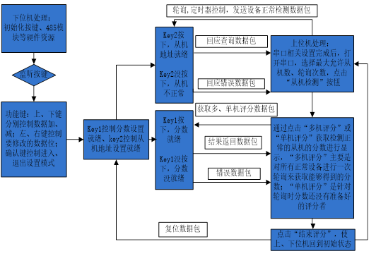 首先通过模数转换模块启动AD转换,对P1.7口的模拟值不断进行采集和处理,由此判断五个方向的哪个方向被按下,从而对数码管相应位进行数值修改;按下KEY1,KEY2键触发外部中断0和外部中断1,使设置完成标志位flag_num和flag_score置1;根据上位机主控制器发送数据包的格式(五个字节的数据),下位机将接收到的数据不断存入缓存数组rec[]中,下位机对接收的数据包进行处理和判断(包头、功能码以及自定义数据有效性),将发给上位机的数据包存入缓存数组send[]中,上位机主控制器根据反馈回来的信息做出相应的处理,若数据发送正常上位机将接收显示下位机传送的从机编号和评分。由于挂载在总线上的从机数在一定范围内不受限制,从而可以达到多个下位机同时独立评分的功能。