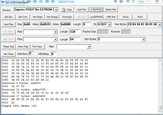 1.       点击菜单Options,选择“EZ-USB Interface”弹出下图,单击图中的Lg EEPROM,在弹出的对话框中选择已经编译并添加了启动方式选择的固件。稍等片刻,烧写即可完成(擦除与烧写步骤相同,将烧写固件换成擦除eeprom使用的空白固件即可)