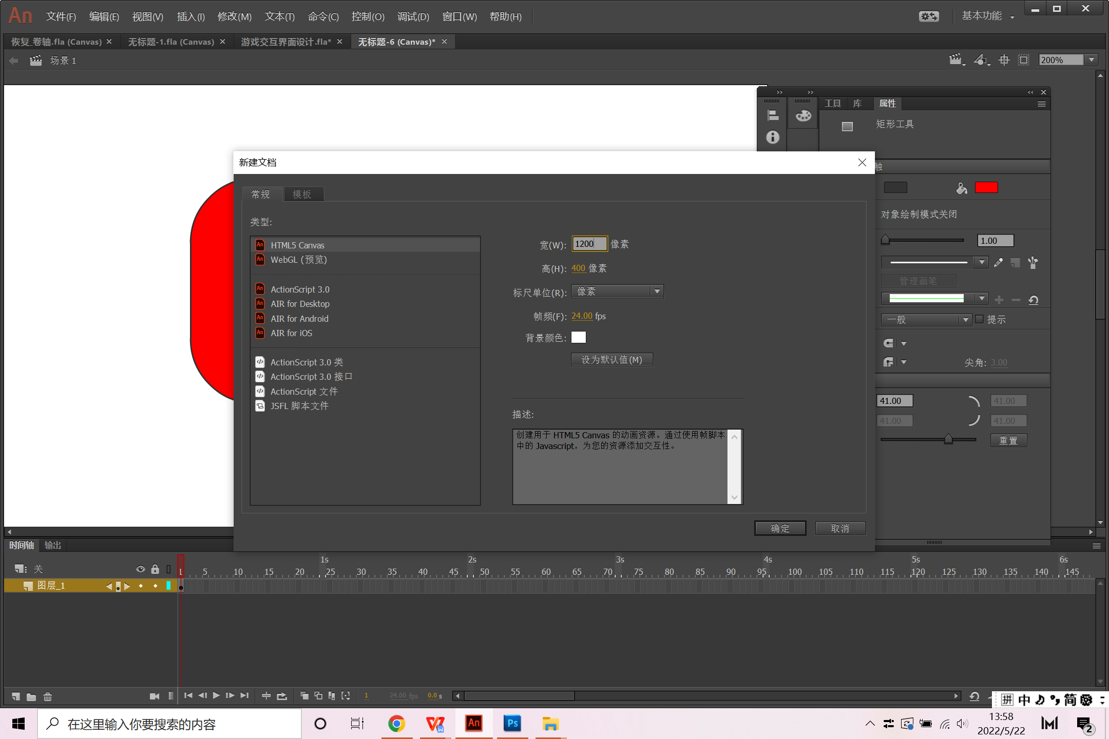 1、重点:能够在animate软件里创建两种不同语言形式的文件。