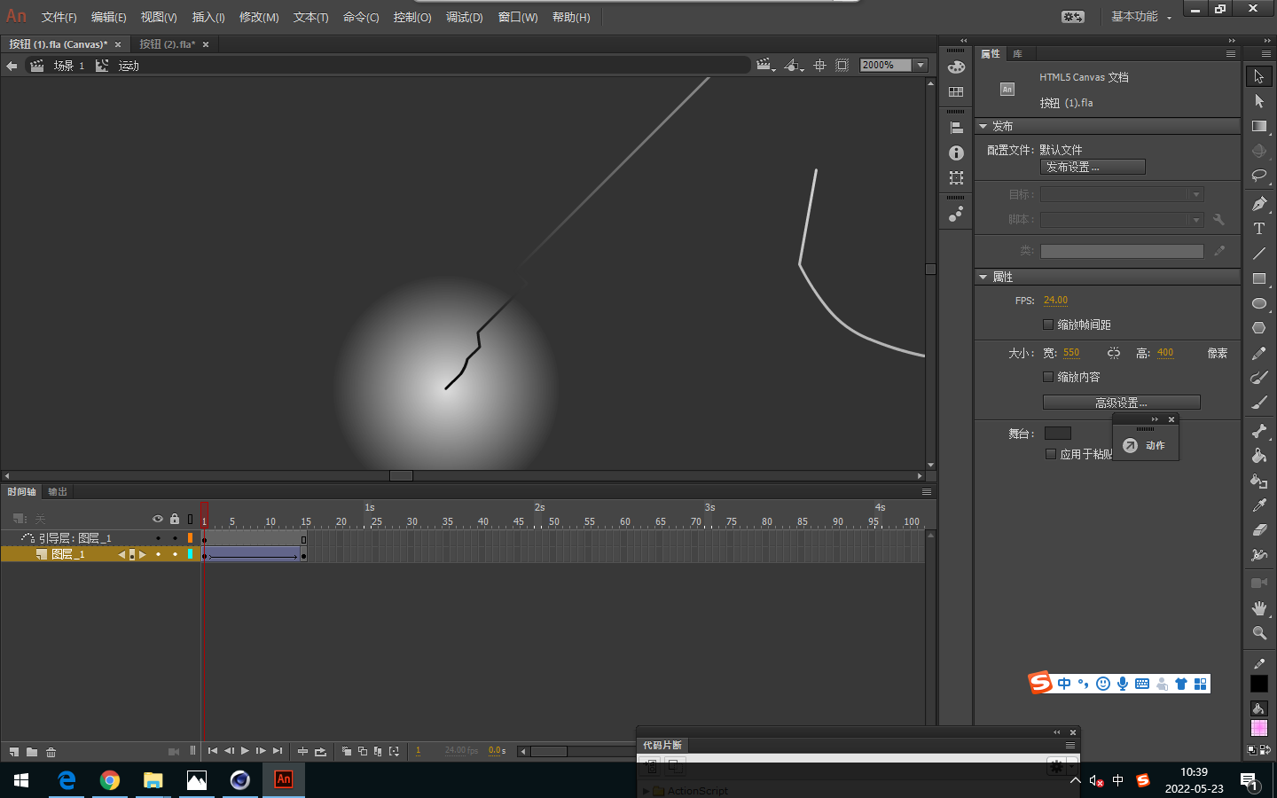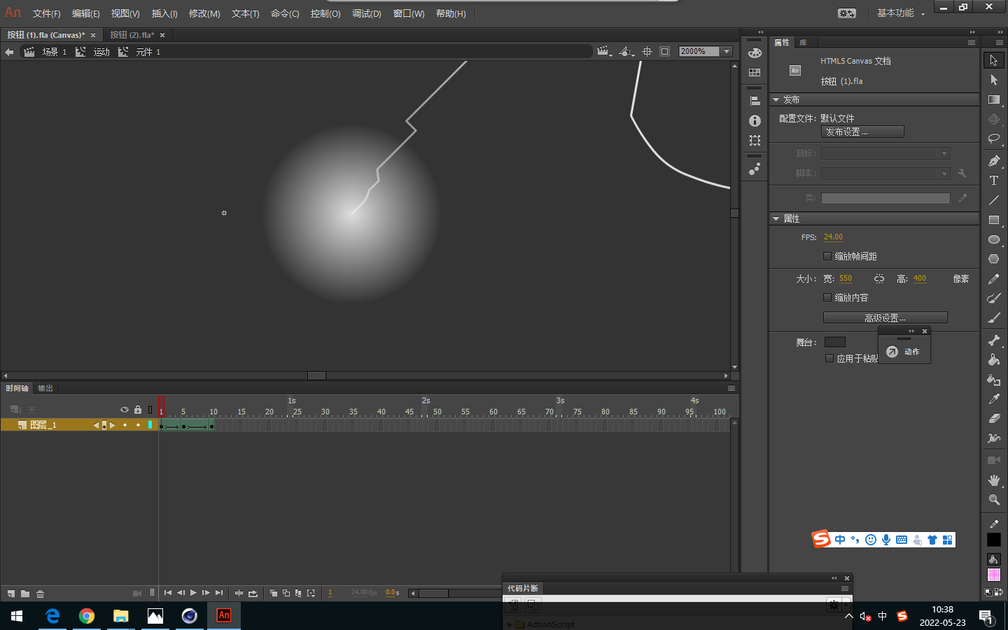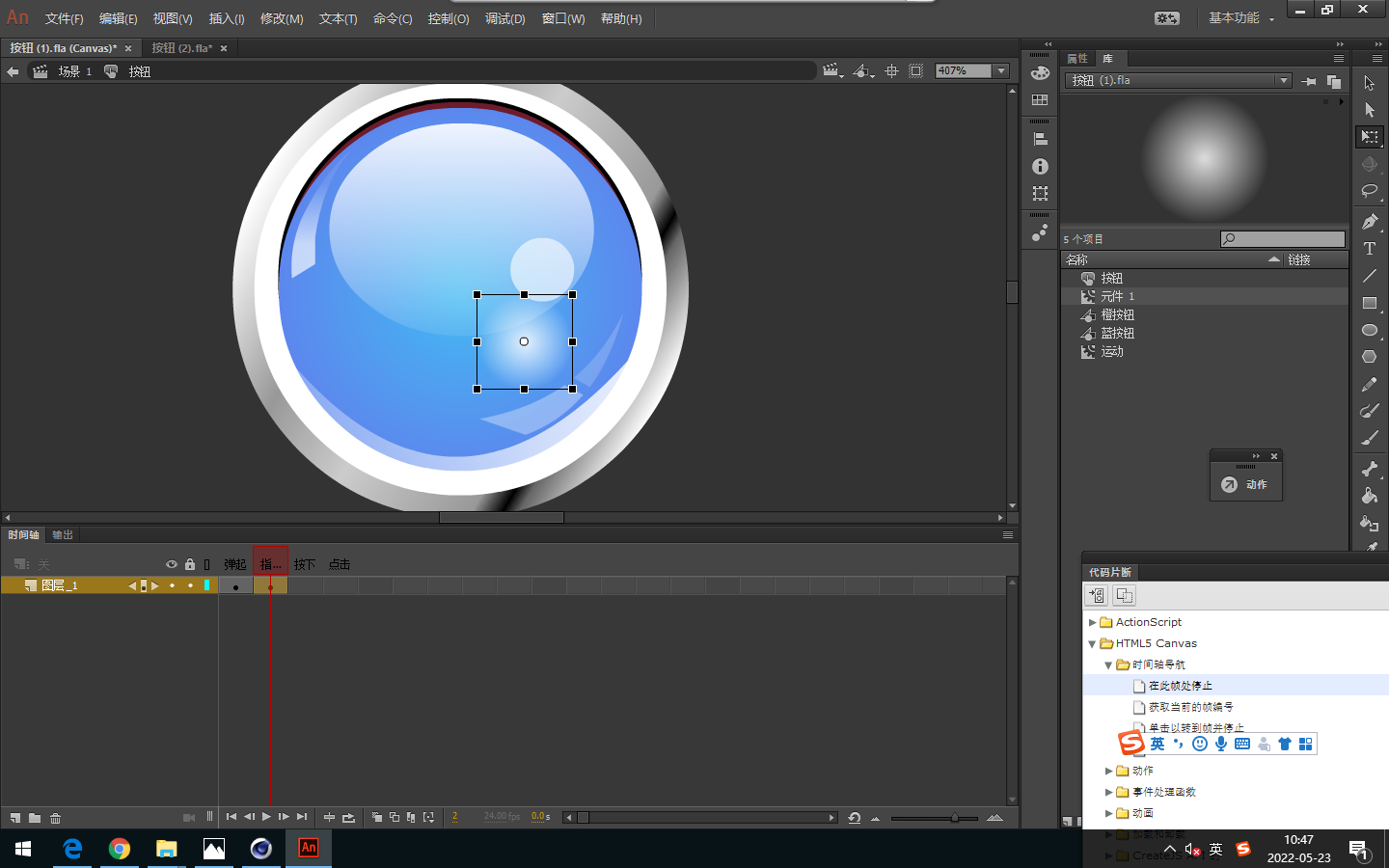 1、课堂制作按钮动画,将绘制好的水晶按钮,制作出鼠标经过的状态动效。