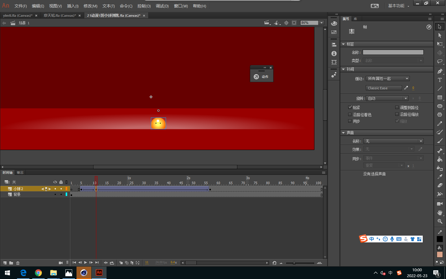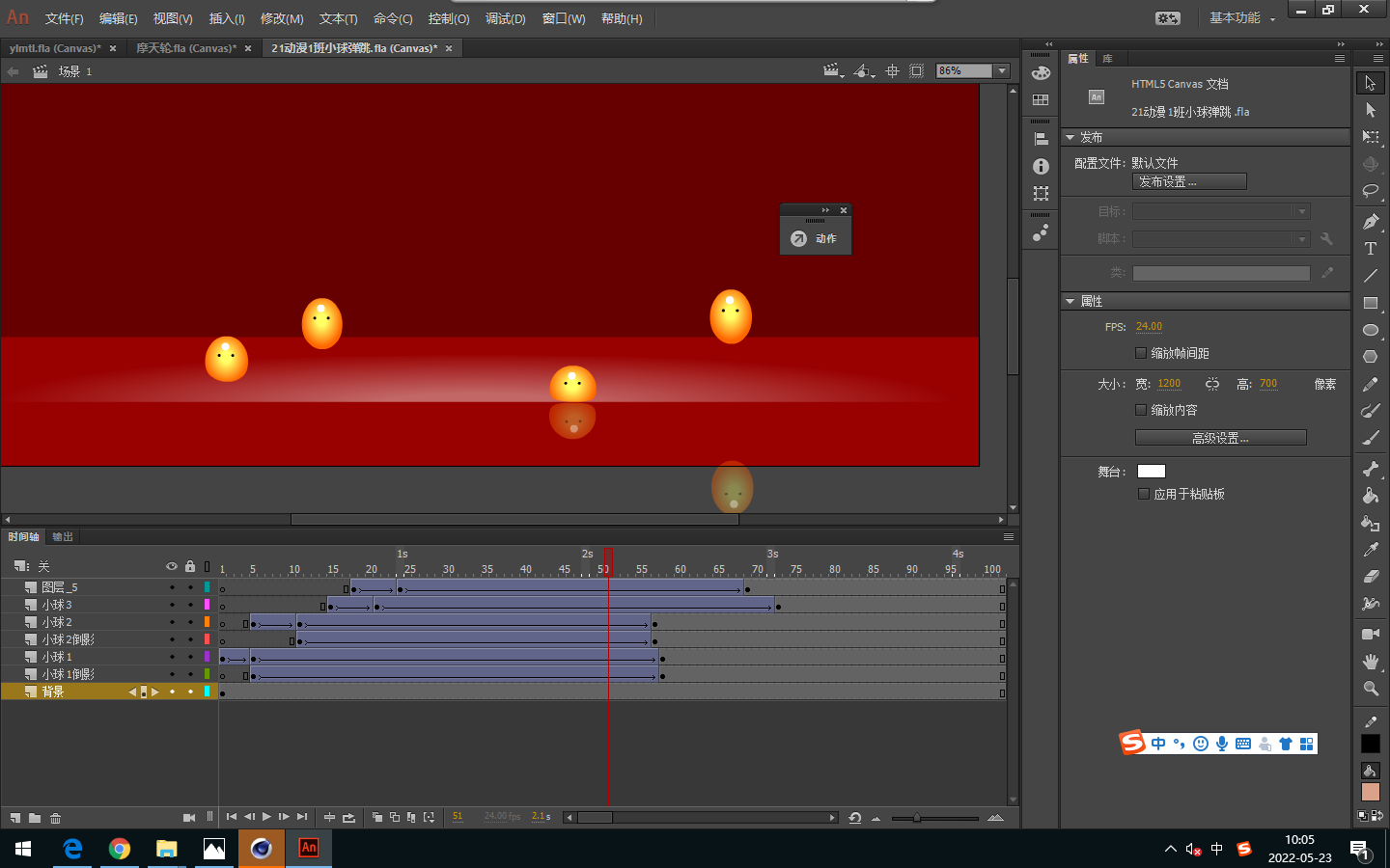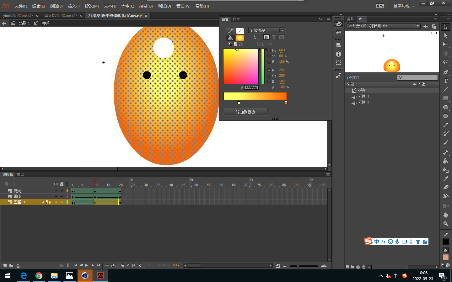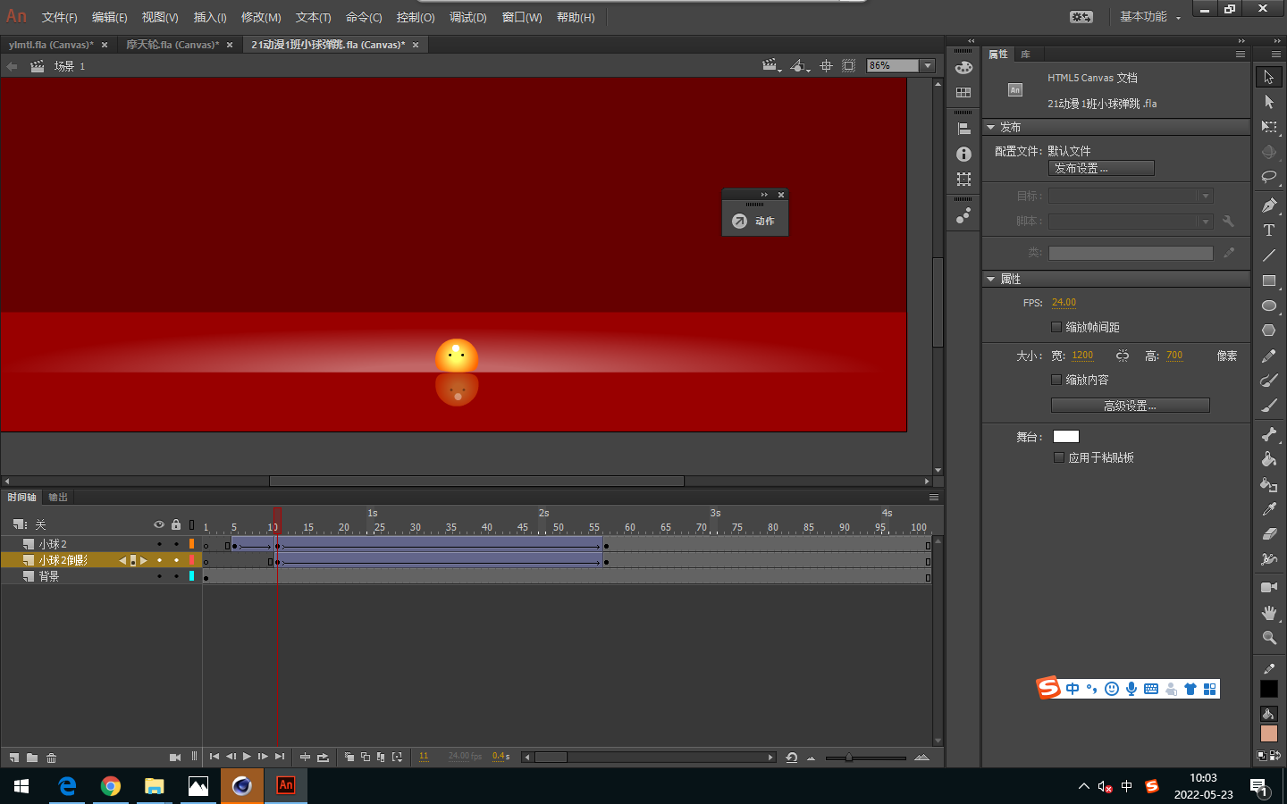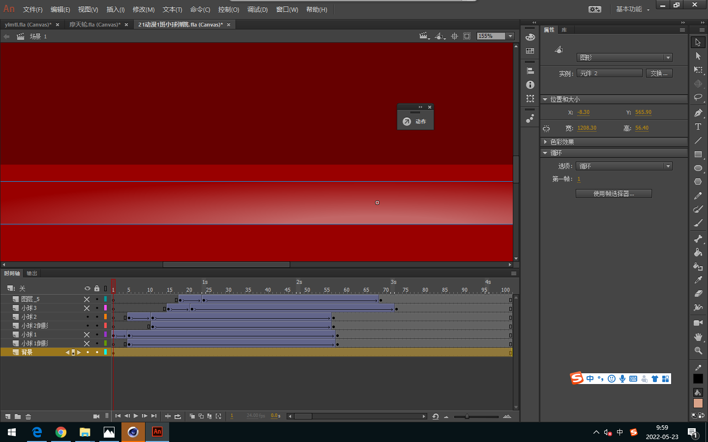 2.渐变的颜色透明度的更改。将制作好的弹性小球转变为元件,放到场景里,调节他的掉落位置,制作成掉落动画,并且进行位移。