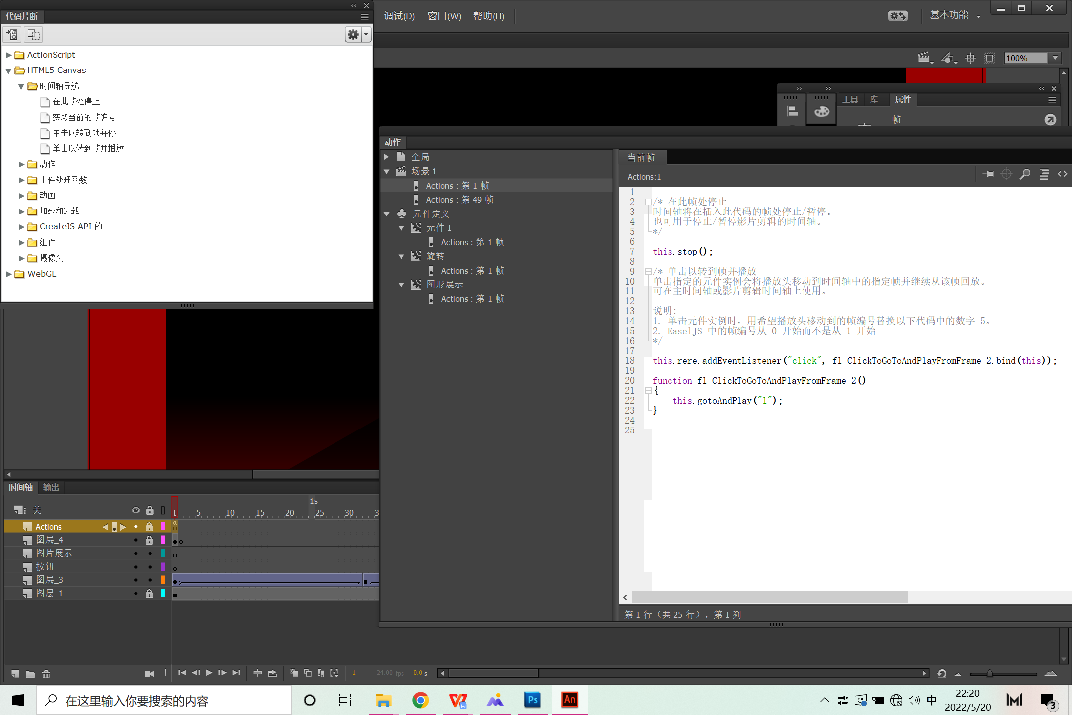 三、第一个关键帧添加停止命令。点代码片段-时间轴导航-在此帧处停止。