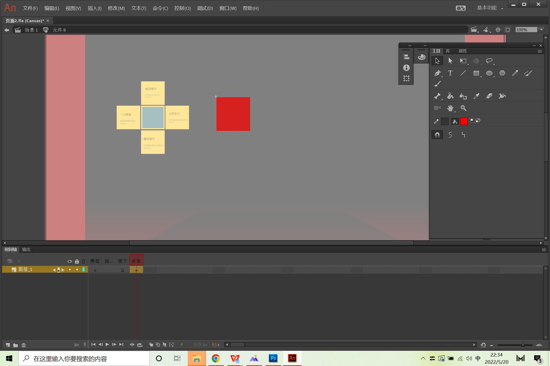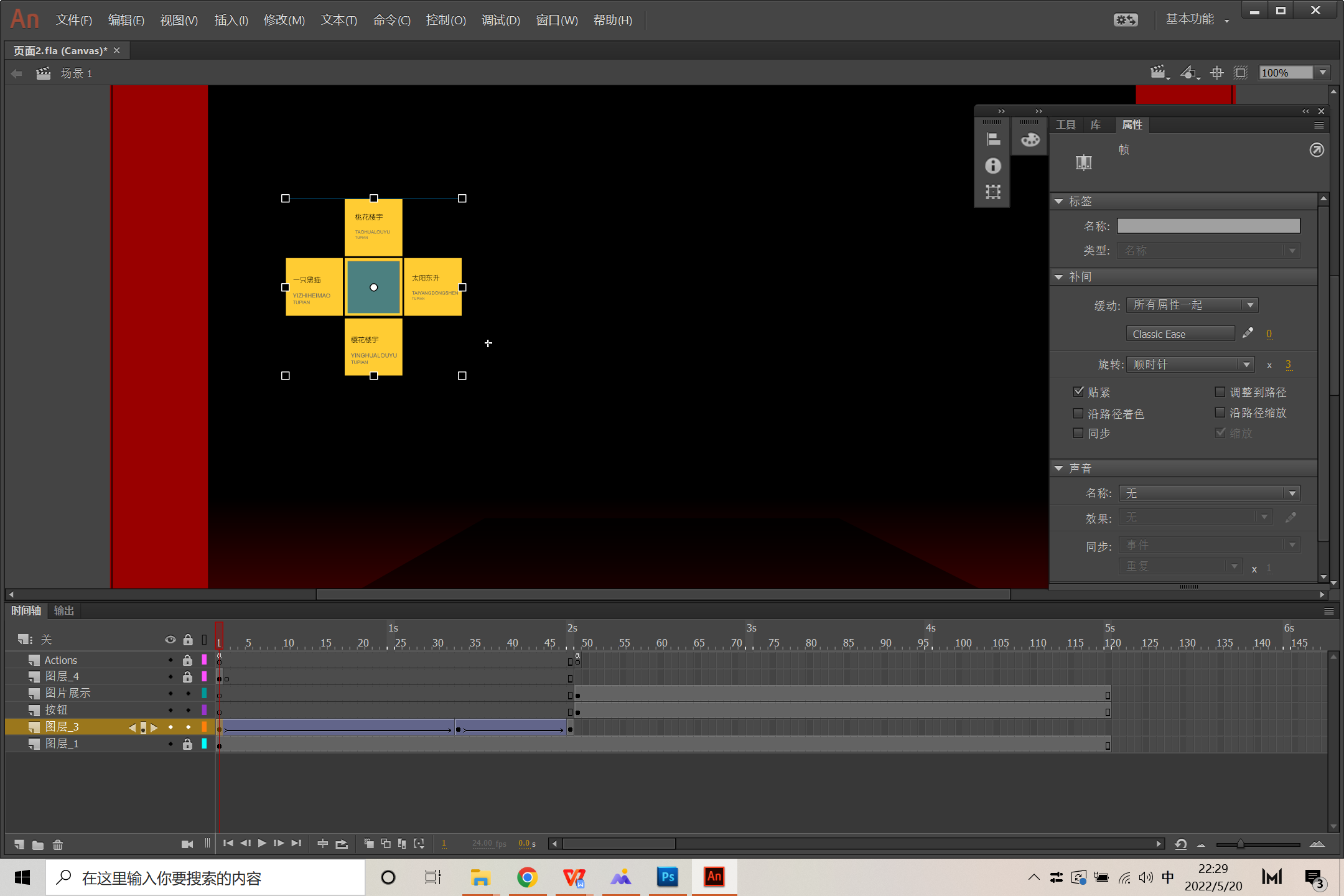 1、将整个十字形影片剪辑,放到场景里制作旋转补间动画。