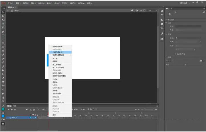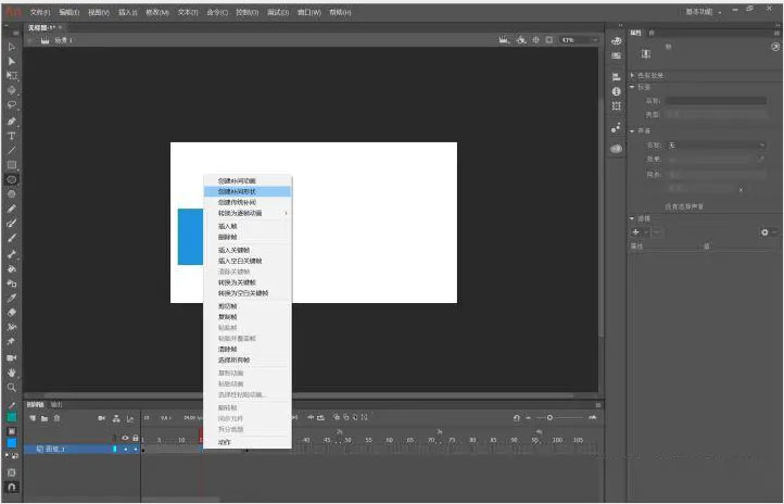 通过形状补间动画,我们能够实现物体形状变化上的动画。与之前传统补间动画不同的是,我们在这里不需要转化为“元件”。同样的,我们在想要结束的地方打上关键帧,并进行形状修改,在两个关键帧之间右键选择“创建补间形状”。