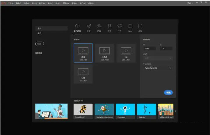 1、重点:能够在animate软件里创建两种不同语言形式的文件。