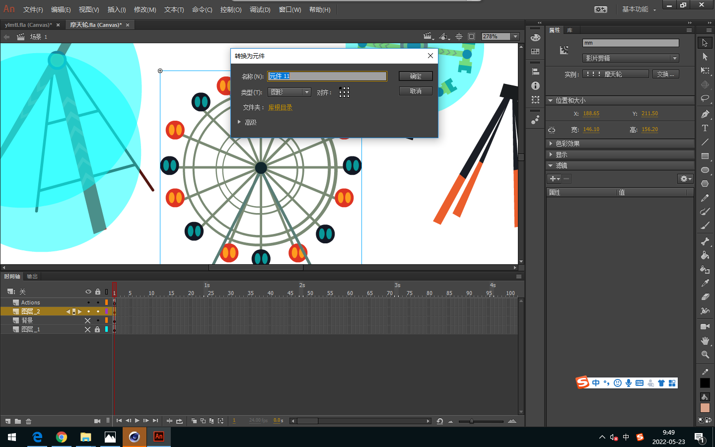 3、能够将绘制矢量图转换为图形元件,并且添加补间动画。