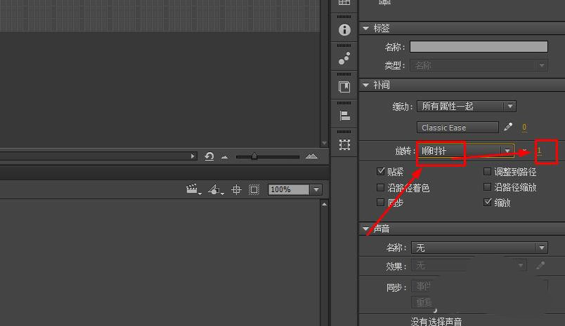 7、选择补间帧,在属性面板中设置旋转参数。