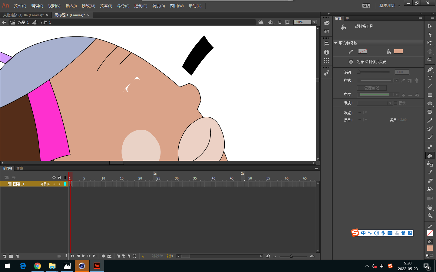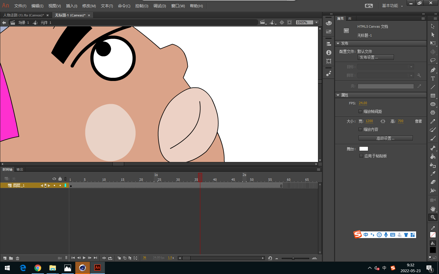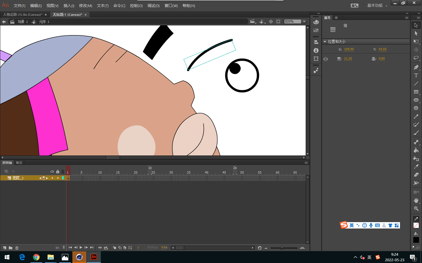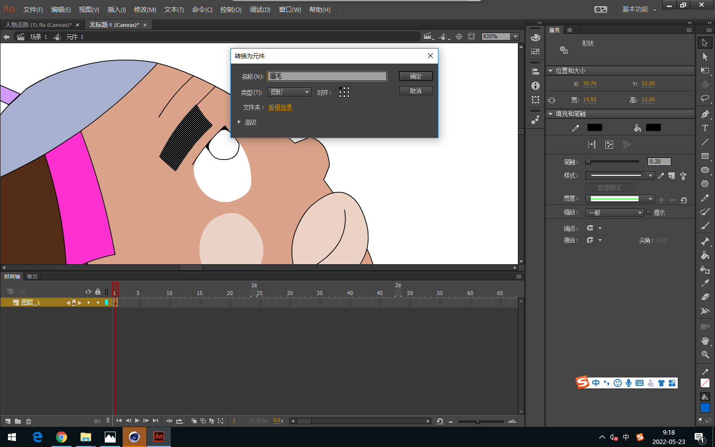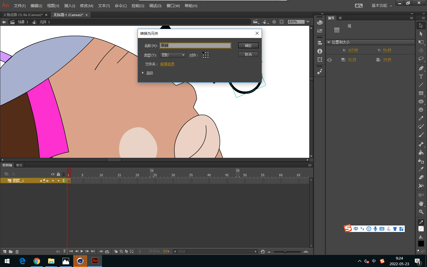 1、点开头部图形元件,把眉毛和眼睛分别右键转换成图形元件,并且命名。用油漆桶工具把脸部缺失的颜色修补好。