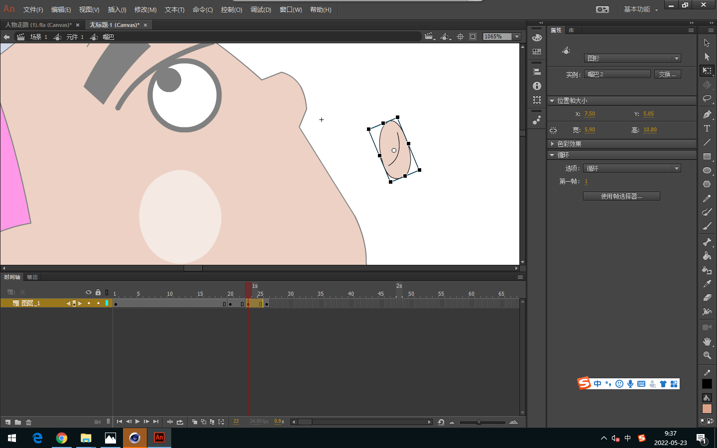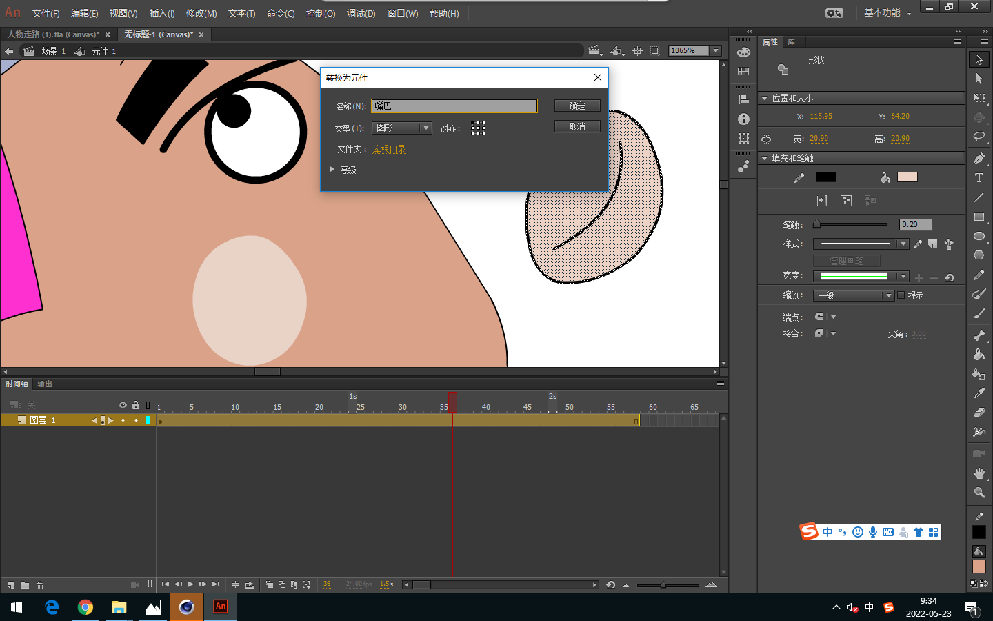 6、制作嘴巴动画。打关键帧,调节嘴巴形状,不需要补间。选中绘制的嘴巴图形,右键转换为图形元件,命名嘴巴。