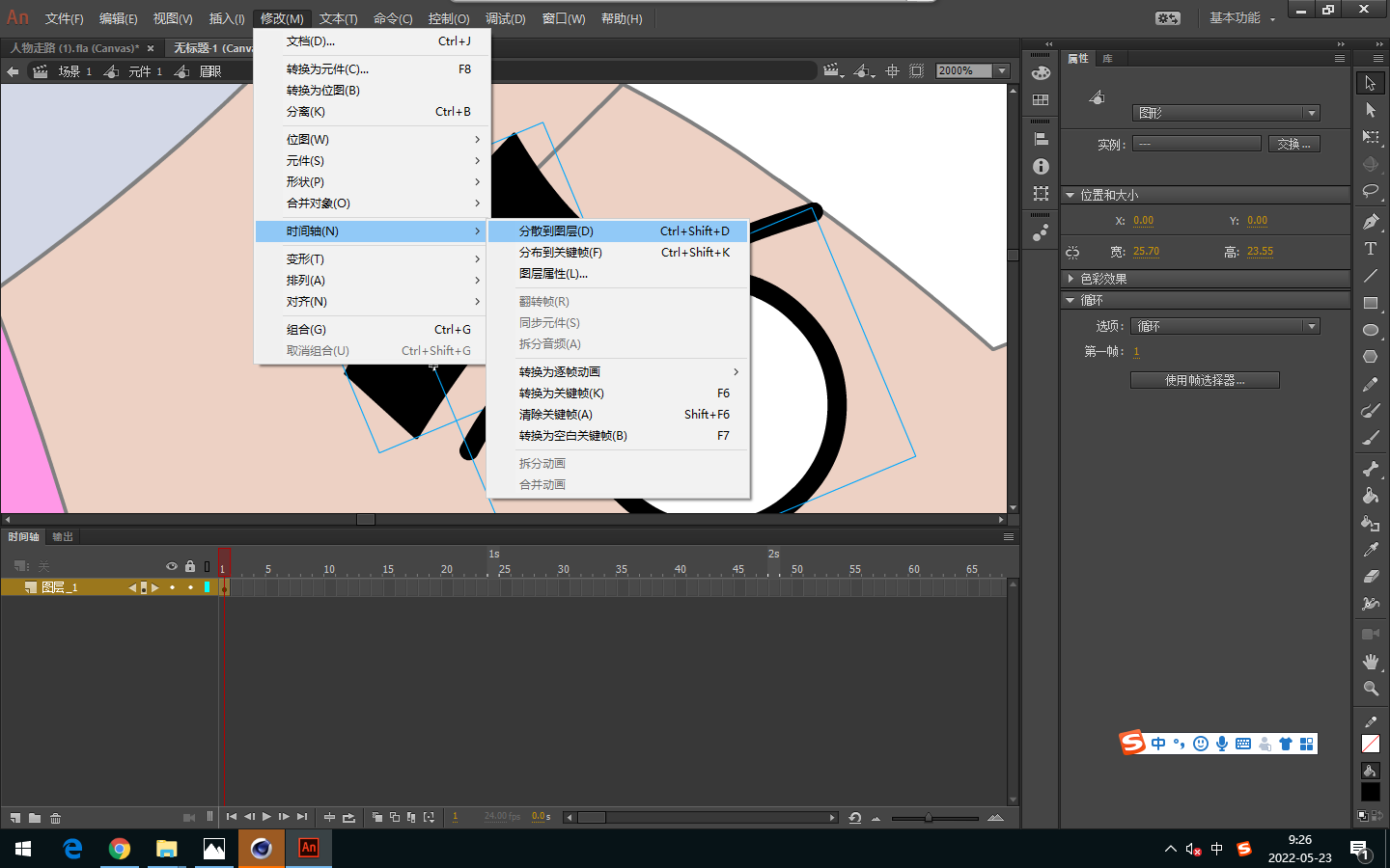 3、能够将绘制矢量图转换为图形元件,并且添加补间动画。