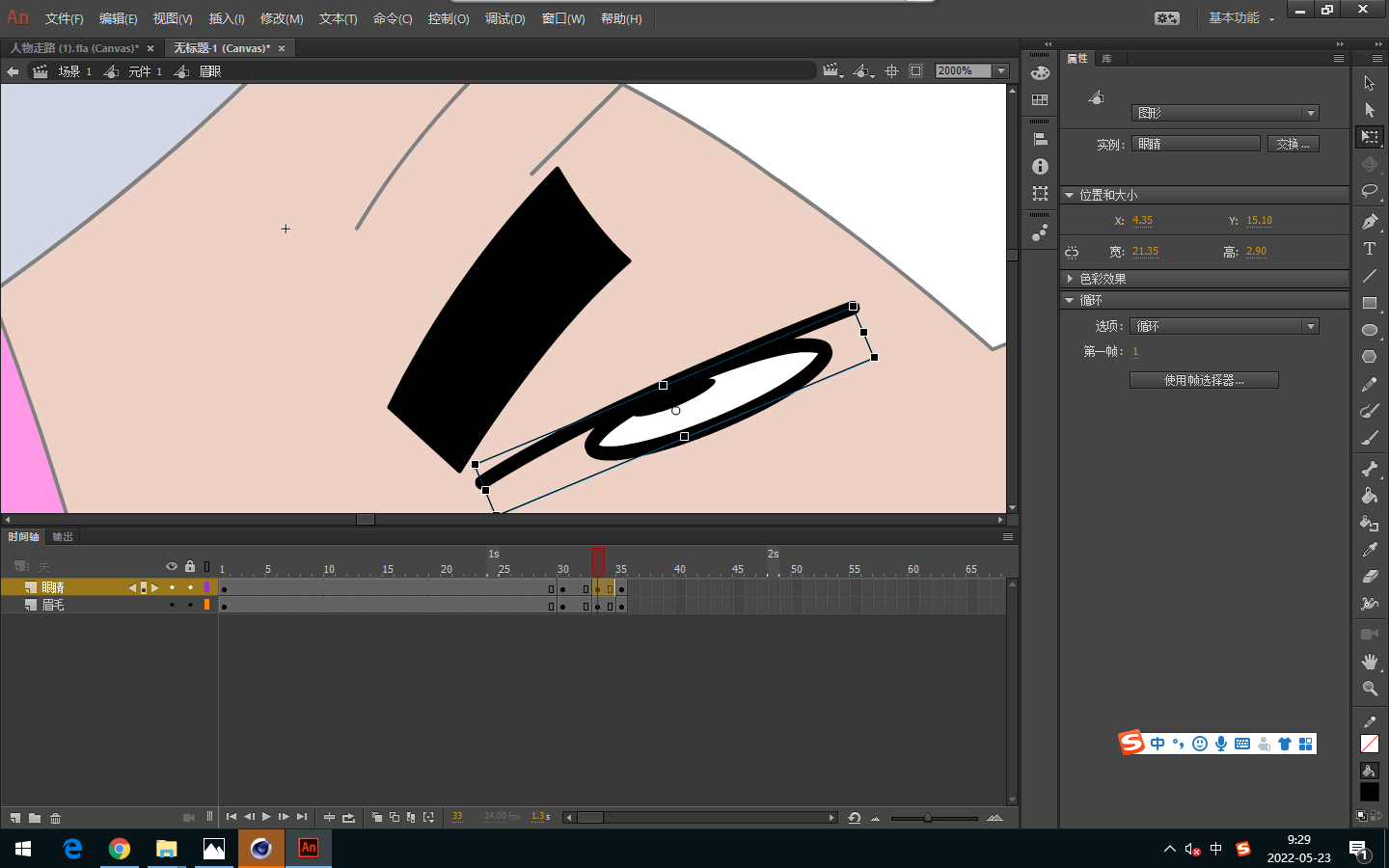 4、打关键帧,用任意变形工具调节形状,不用打补间。制作出眨眼的效果。
