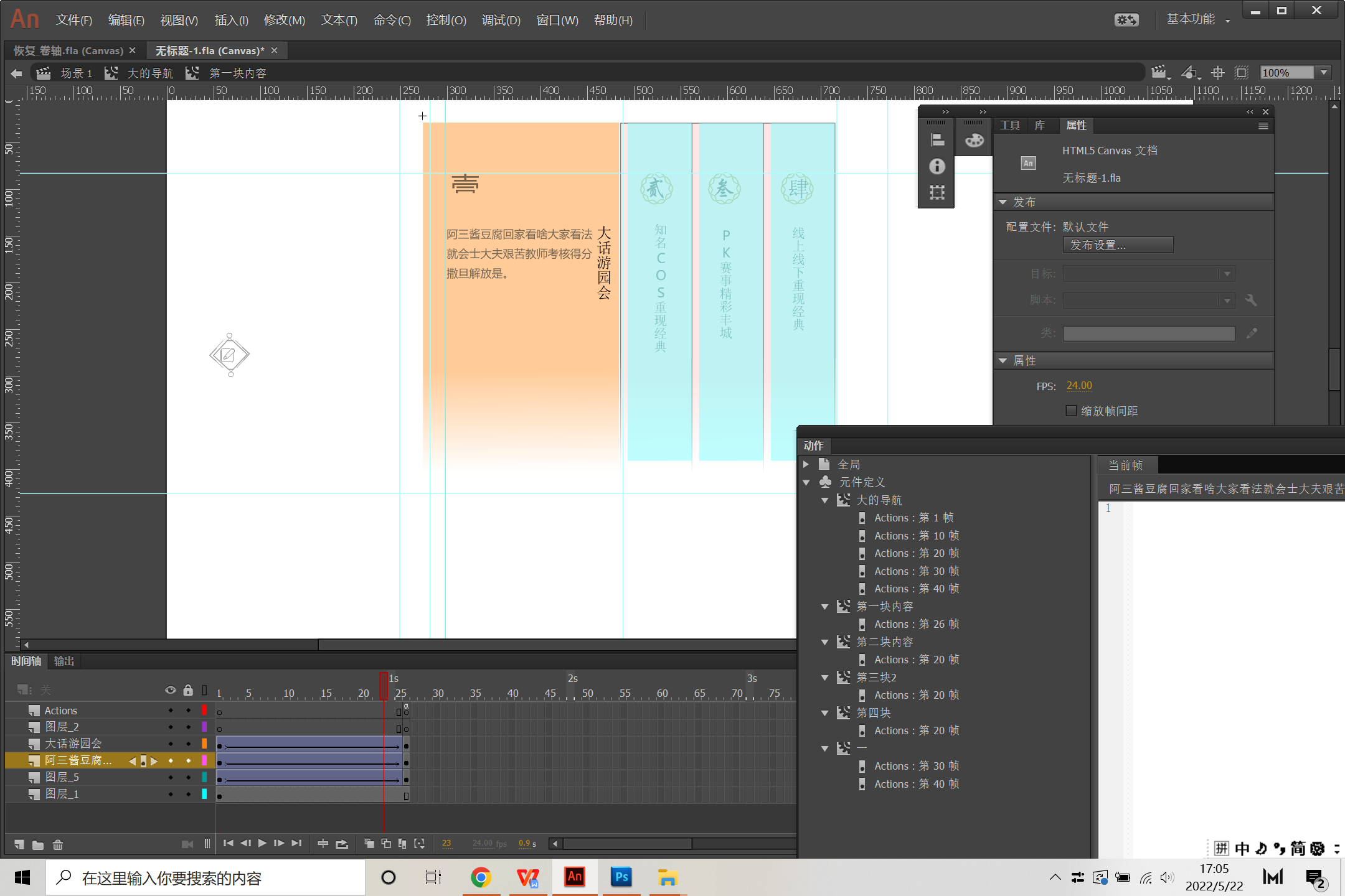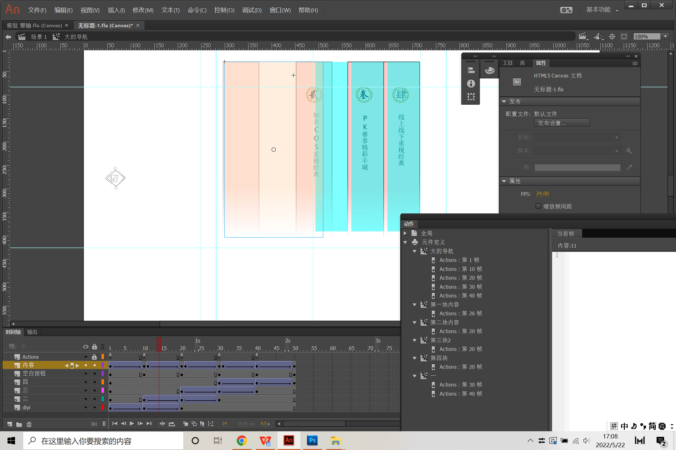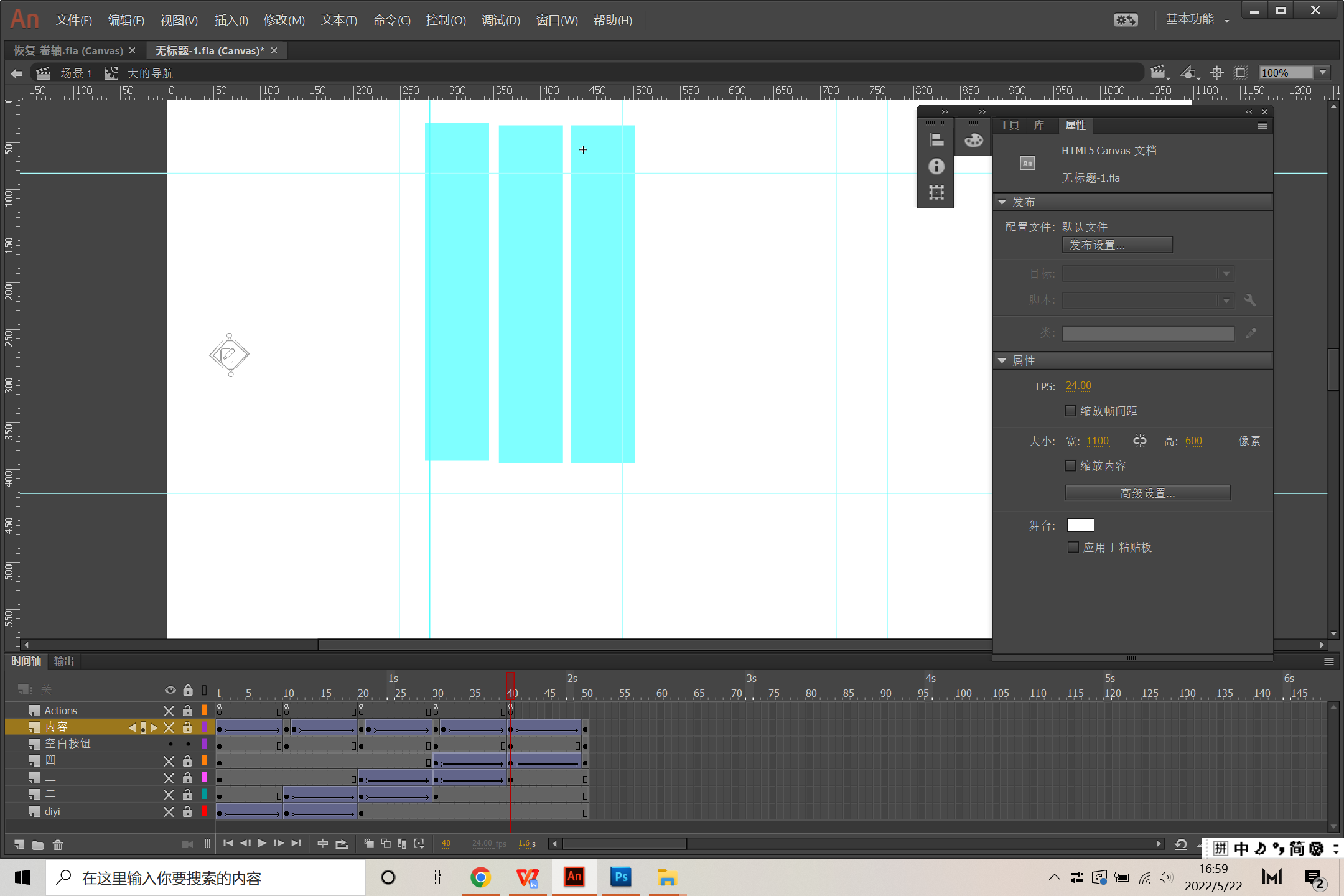 4、回到上一级,让那内容影片剪辑也制作成从无到有的动画。整体按要求排列好。