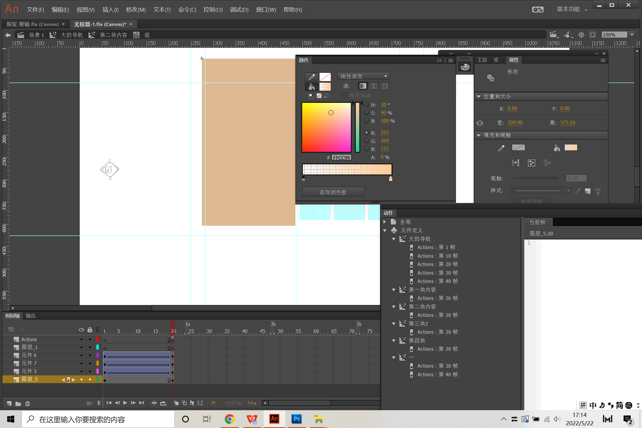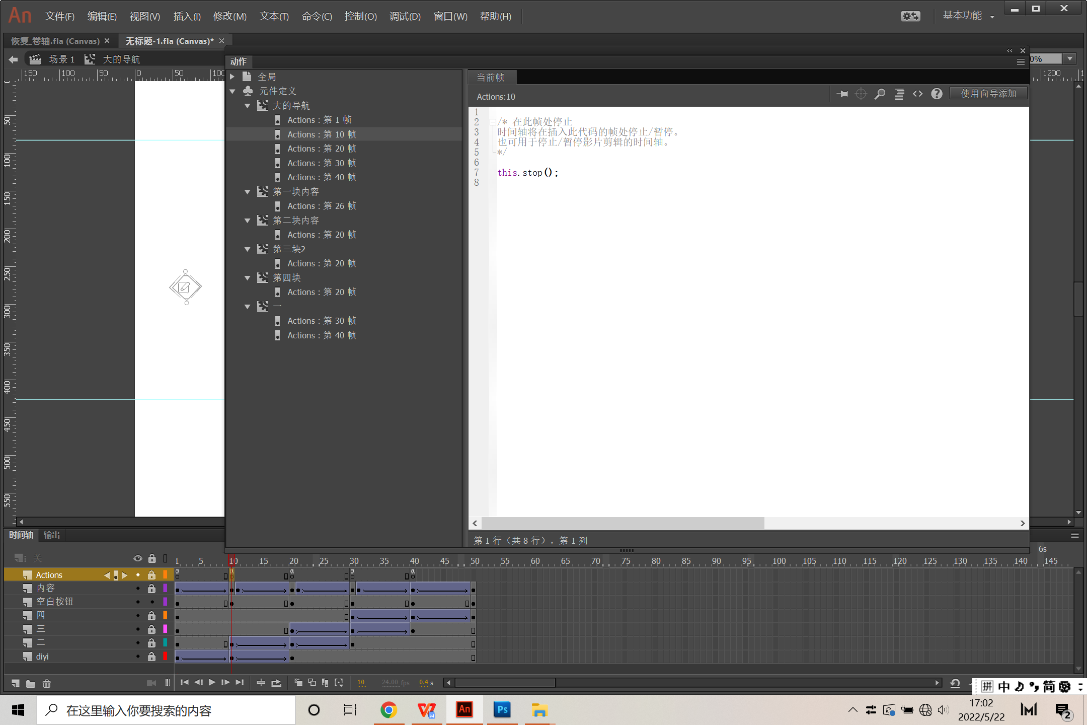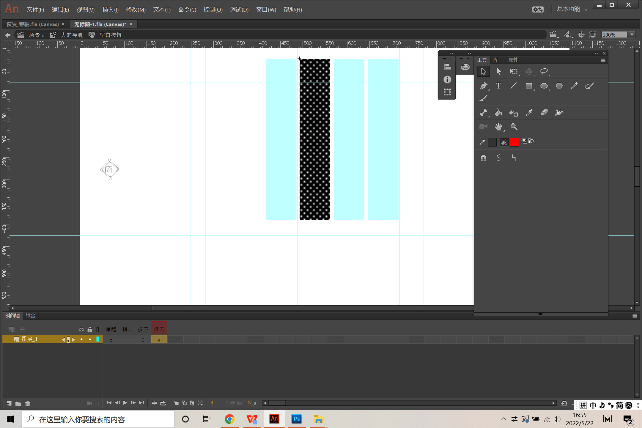 4、回到上一级,让那内容影片剪辑也制作成从无到有的动画。整体按要求排列好。